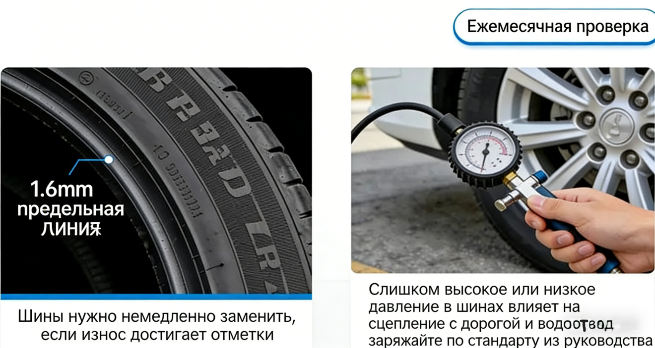 Правильный выбор шин — это только первый шаг, ключевое значение имеет регулярное техническое обслуживание. Ежемесячно проверяйте состояние рисунка протектора: как только износ достигает индикатора износа (1,6 мм), немедленно заменяйте шины, не питая иллюзий. Перед поездкой в дождь проверяйте давление в шинах: при слишком высоком давлении площадь контакта шины с дорогой уменьшается, что ухудшает сцепление и водоотвод; при слишком низком давлении шина деформируется, что также негативно сказывается на торможении. Накачивайте шины строго в соответствии с рекомендациями, указанными в руководстве по эксплуатации автомобиля.
