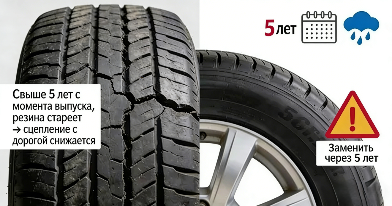 Существует ещё один часто упускаемый из виду нюанс: старение шин. Даже если рисунок протектора ещё глубокий, по истечении 5 лет с даты производства резина начинает твердеть и покрываться трещинами, что приводит к существенному снижению сцепных свойств и резкому росту рисков при движении в дождь. Поэтому даже при минимальном пробеге шины старше 5 лет рекомендуется заменить.