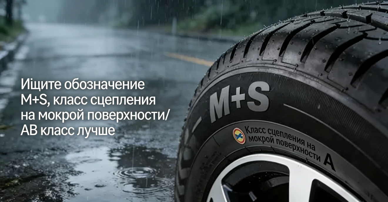 Второе: проверяйте маркировку — наличие обозначения «M+S» / рейтинга сцепления на мокром покрытии повышает надёжность в дождь