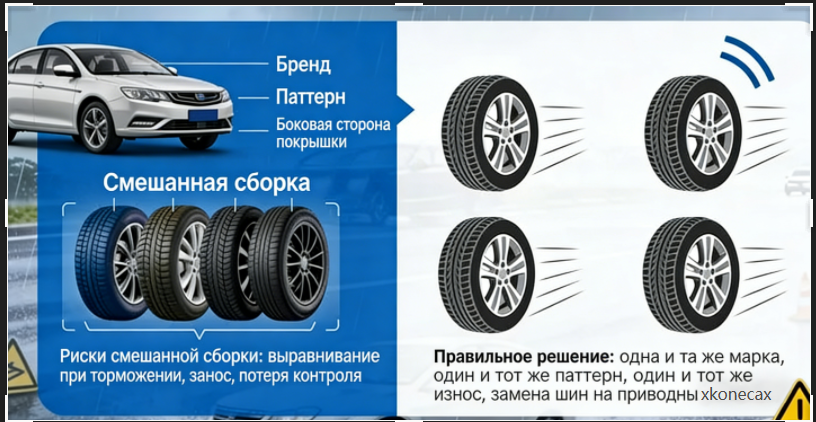 Четвёртое: не допускайте комбинации разных шин — все четыре колеса должны иметь одинаковые характеристики и рисунок протектора