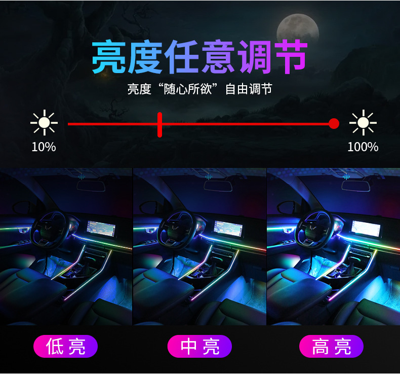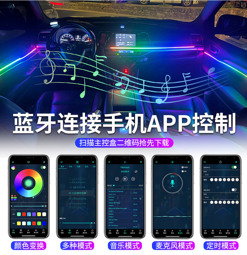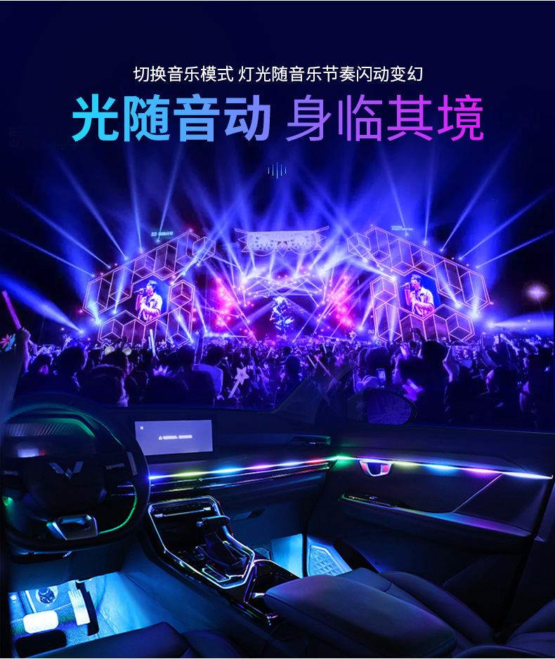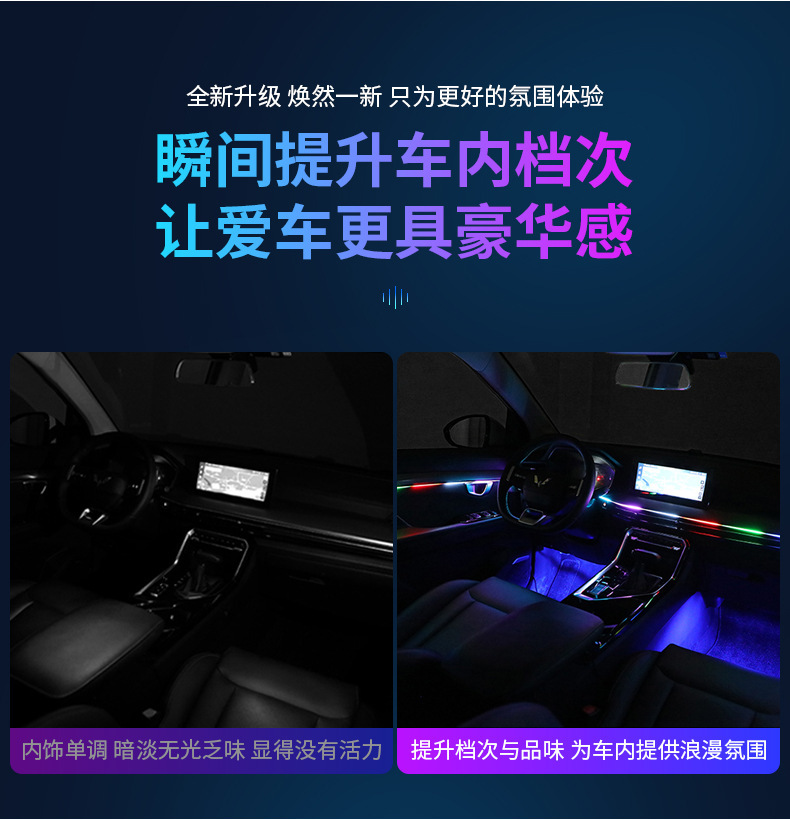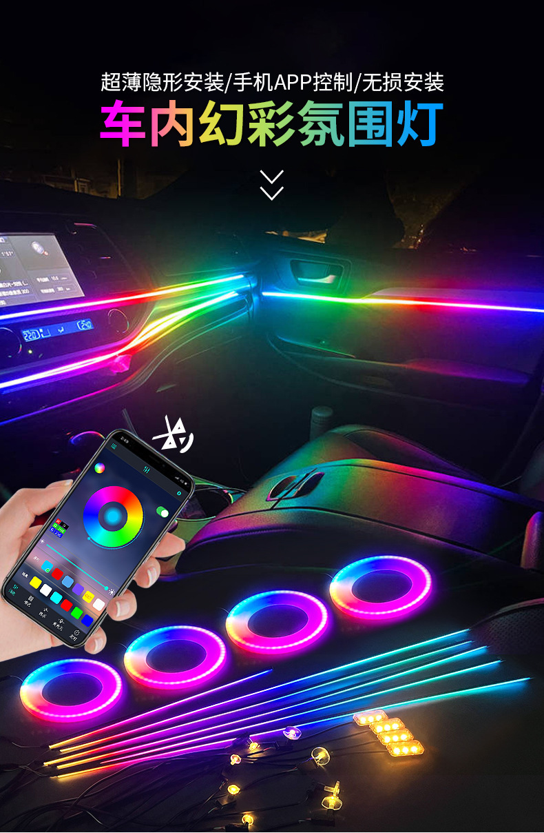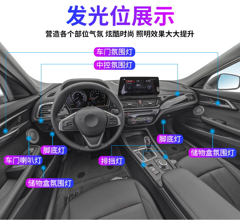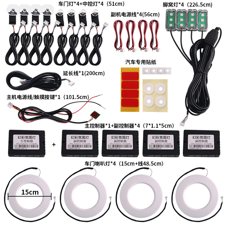 幻彩1拖22:6条LED灯带(110cm*1+75cm*4+35cm*1)+1主控盒+4副控+4氛围灯+4门碗灯+4储物灯+4喇叭灯