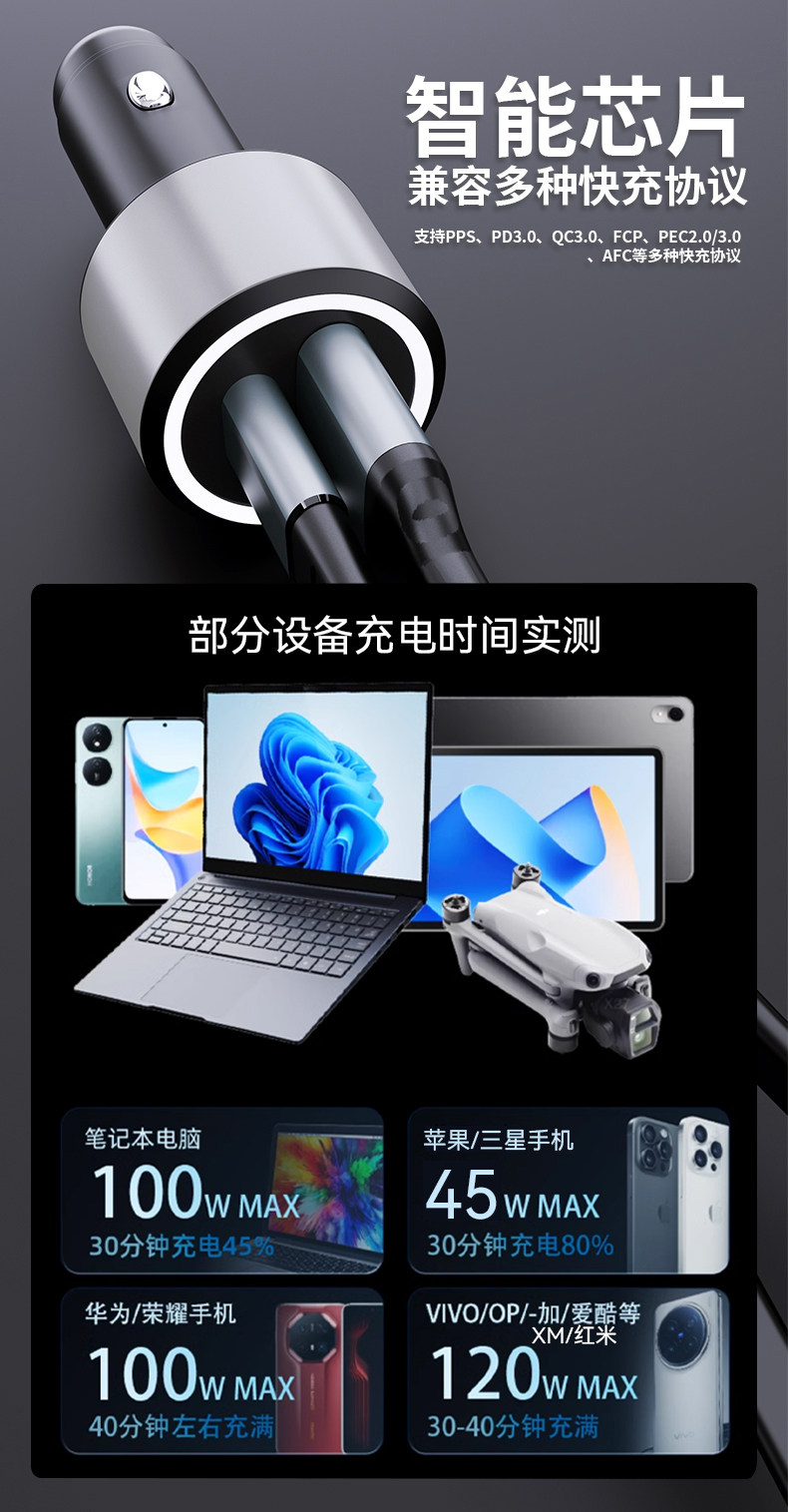 ДомМагазинАвтомобильное зарядное устройствоАвтомобильное зарядное устройство мощностью 120 Вт с поддержкой всех протоколов, совместимое с Xiaomi, Huawei, OPPO, Honor SuperCharge и Vivo FlashCharge.