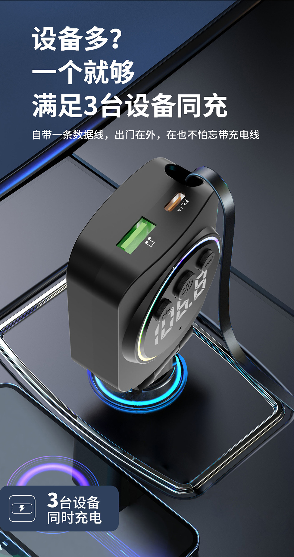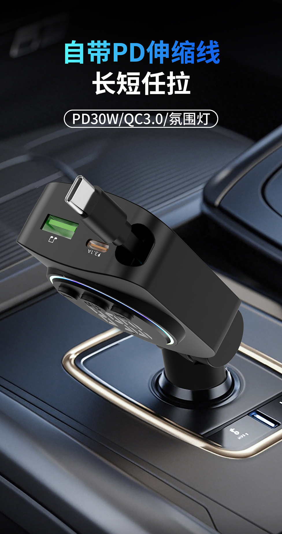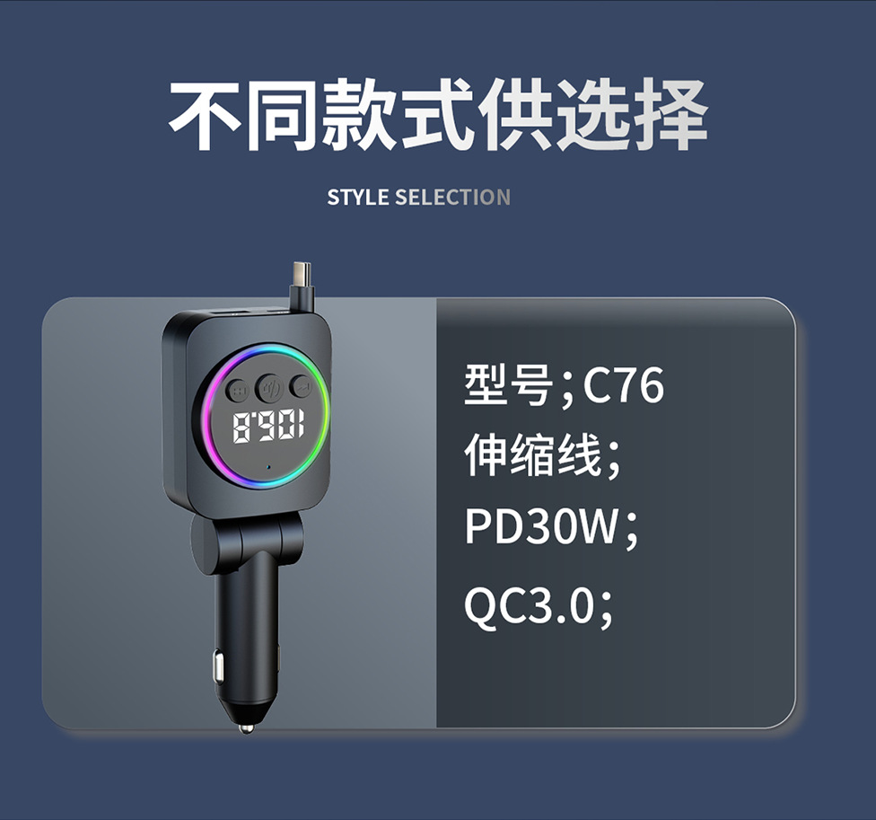 ДомМагазинАвтомобильное зарядное устройствоАвтомобильное зарядное устройство с выдвижным кабелем, быстрая зарядка, 45 Вт, цифровой дисплей, многофункциональное зарядное устройство «три в одном», прочное автомобильное зарядное устройство с прикуривателем