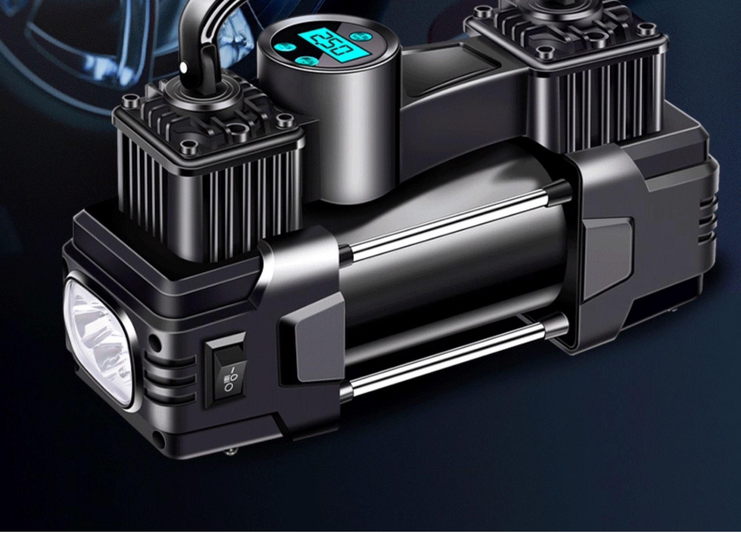 ДомМагазинВоздушный насос, устанавливаемый на транспортное средствоАвтомобильный воздушный насос немецкого качества, двухцилиндровый, высокомощный, металлический, высокого давления, 12 В 220 В для бездорожья.