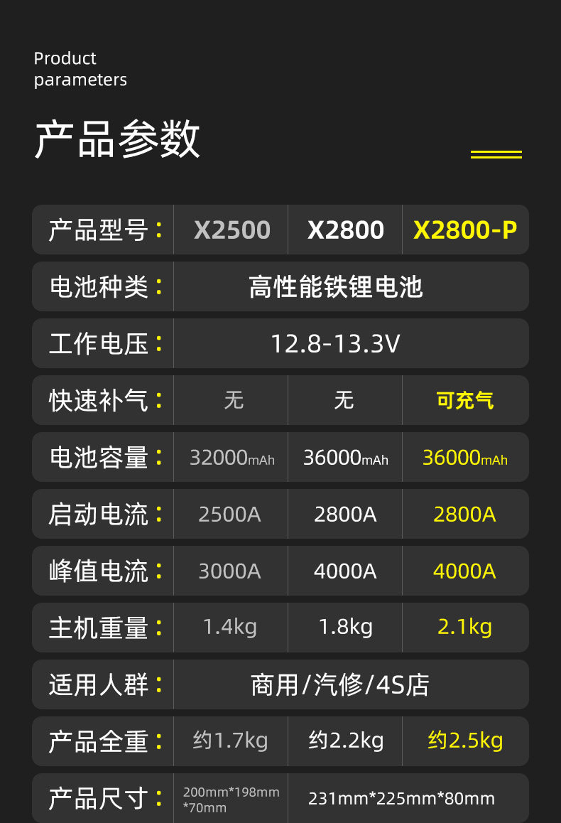 | сортировать по цвету | 【X2800-P】36000 мАч пусковое устройство + воздушное зарядное устройство, 【X2800】36000 мАч улучшенная версия для авторемонта, 【X2500】32000 мАч профессиональная версия для авторемонта |