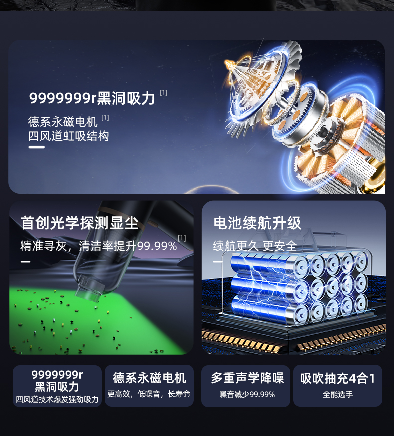 | сортировать по цвету | Бесщеточная модель (модернизированная [Мощное всасывание 5999999r]): лазерный детектор пыли/бесщеточный двигатель/40 минут работы/увеличение заряда на 100%; Бесщеточная модель класса люкс [Мощное всасывание 7999999r]: лазерный детектор пыли/бесщеточный двигатель/40 минут работы/увеличение заряда на 100%; Бесщеточная модель класса люкс [Мощное всасывание 8390000r]: пылесос «2 в 1»/воздуходувка/лазерный детектор пыли/бесщеточный двигатель 3-го поколения/60 минут работы/шумоподавление XE3/увеличение заряда на 200%; Флагманская бесщеточная модель [8999999r Storm Suction]: пылесос 3-в-1 / воздуходувка / экстрактор / лазерный детектор пыли / бесщеточный двигатель 5-го поколения / время работы 70 минут / шумоподавление XE5 / увеличение зарядки на 200% / сумка для хранения; Бесщеточная модель Supreme [9390000] [9999999r Black Hole Suction] 4-в-1 всасывание, выдув, извлечение и зарядка / лазерный детектор пыли / бесщеточный двигатель 8-го поколения / время работы 80 минут / шумоподавление XE8 / увеличение скорости зарядки на 500% / лопасти вентилятора из сплава / расширенная щетка для пола / комплект для уборки; Лучшая в линейке бесщеточная модель [9999999r Black Hole Suction] 4-в-1 всасывание, выдув, извлечение и зарядка / удаление клещей Green Light / лазерный детектор пыли / бесщеточный двигатель 10-го поколения / время работы 100 минут / шумоподавление XE10 / увеличение скорости зарядки на 800% / расширенная щетка для пола / комплект для уборки; комплект для сверхбыстрой зарядки [9999999r Black Hole Suction] 4-в-1 всасывание, выдув, извлечение и зарядка / удаление клещей Green Light / лазерный детектор пыли / база для быстрой зарядки / бесщеточный двигатель 10-го поколения / время работы 100 минут / шумоподавление XE10 / увеличение скорости зарядки на 900% / комплект для уборки |
