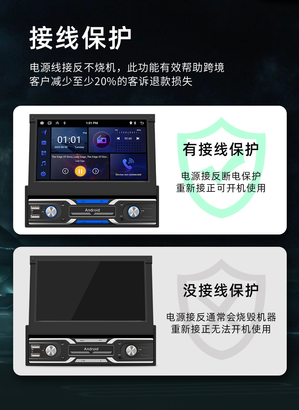 ♦接线保护功能直接帮跨境客户减少至少20%客诉退款损失(跨境客户零售到国外,客人自己安装接线,正负极分不清接错时候正常会直接烧坏机器主板或者保险丝,导致客诉退货或者差评,我司最新研发此产品电源线随便接N次都不会烧机器和保险丝,直到客户接对为止)
