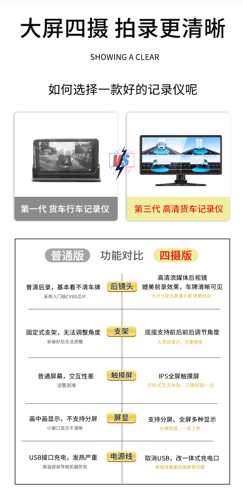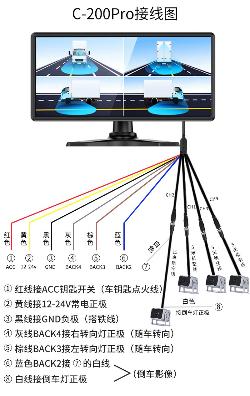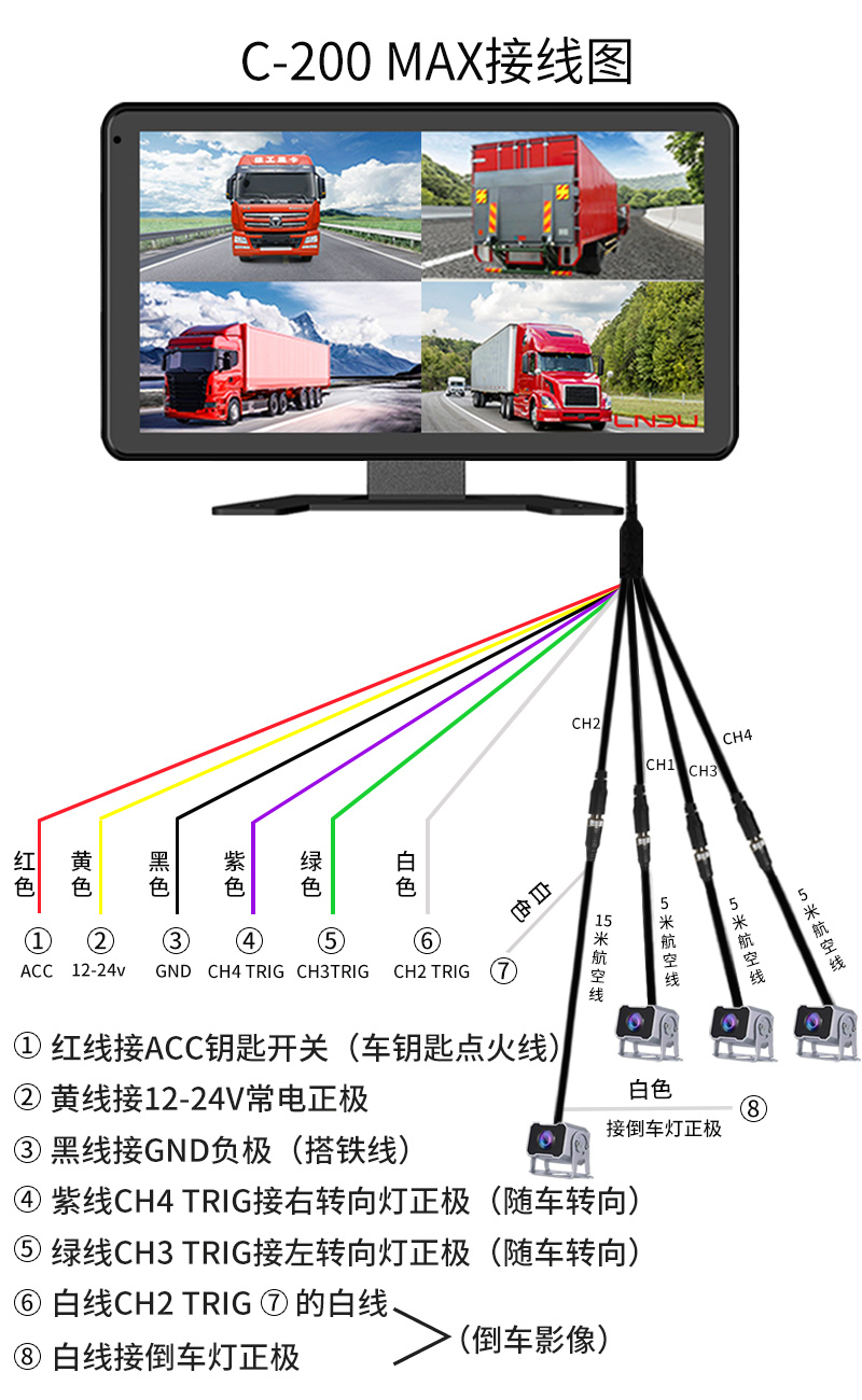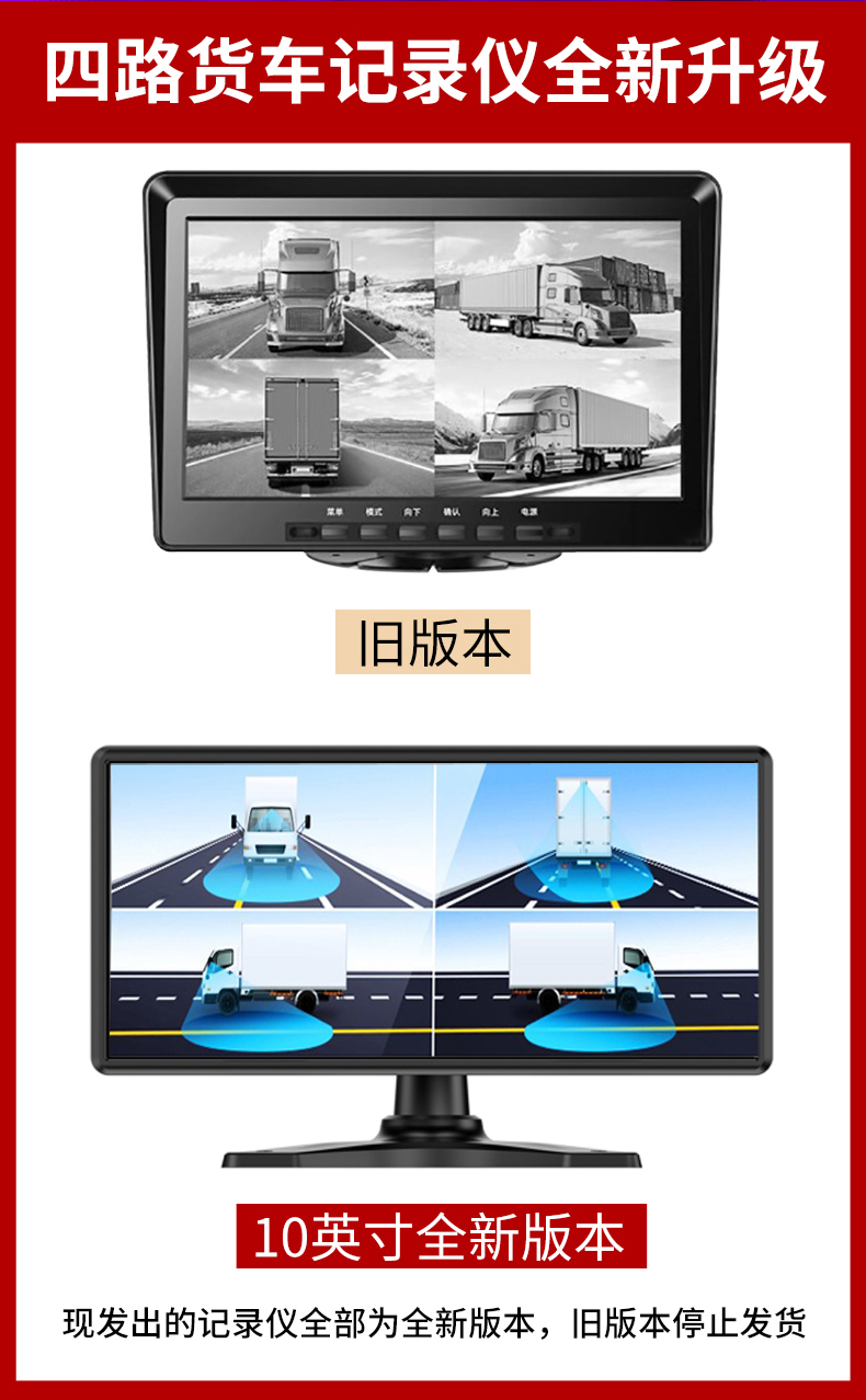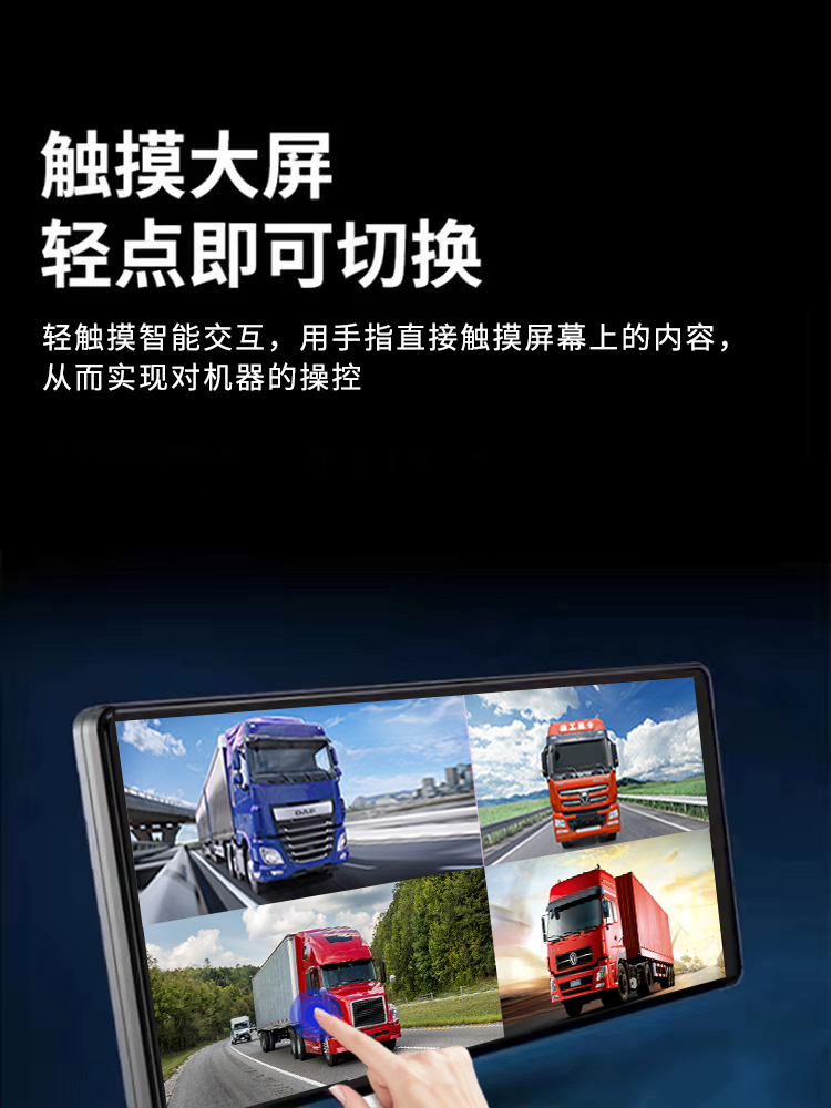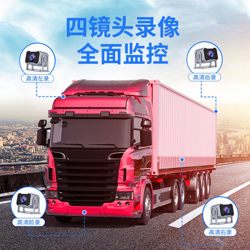 货车倒车影像四路监控记录仪一体机,12V24V车通用。记录仪,循环录像,自动覆盖删除,倒车影像,停车监控,随车转向,高清夜视,语音声控,触摸操作,盲区预警,偷油报警,盲区呈现,声光警告,安全辅助驾驶!