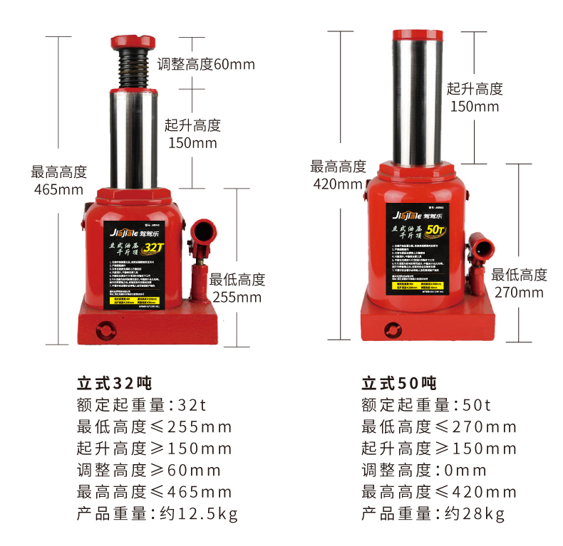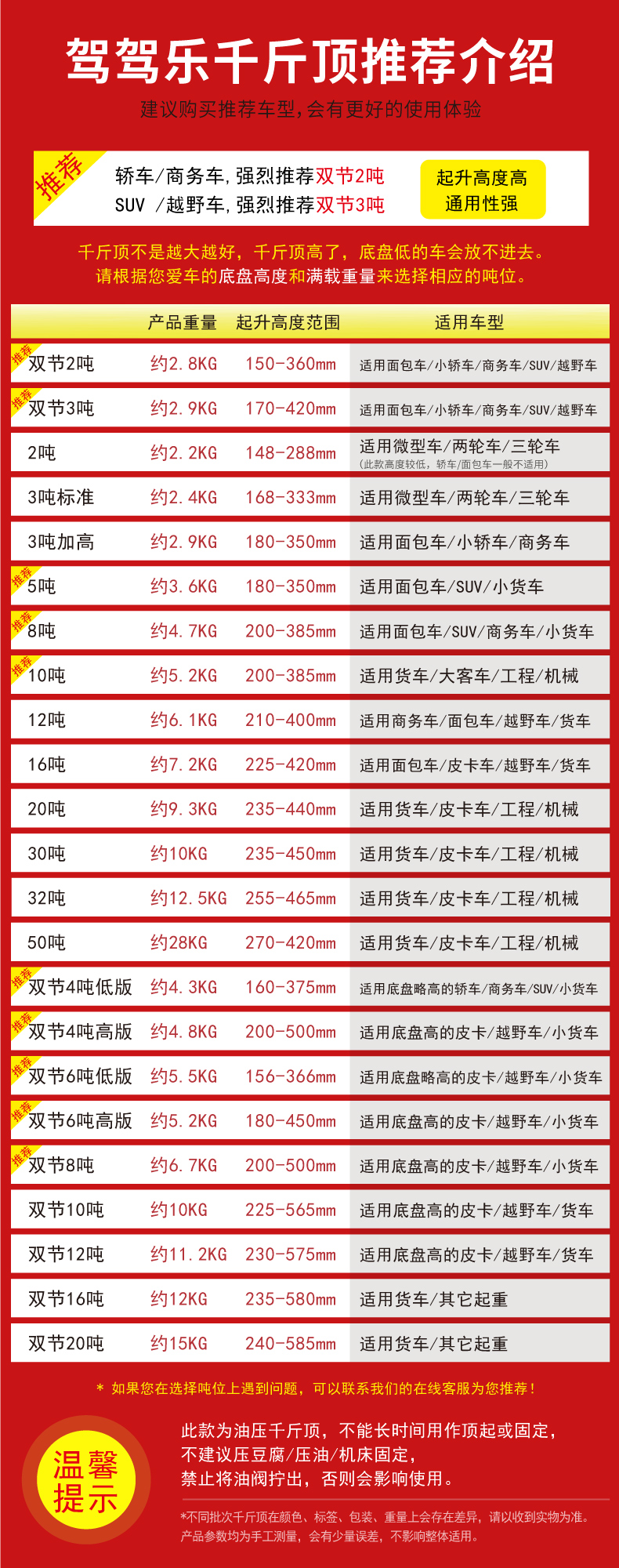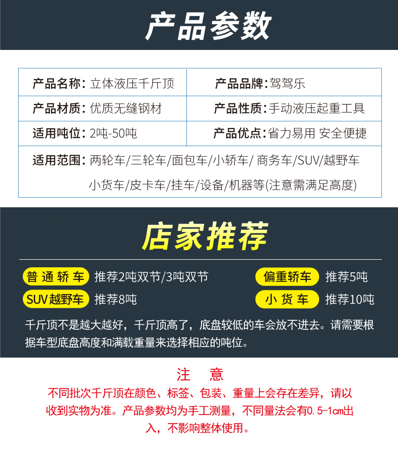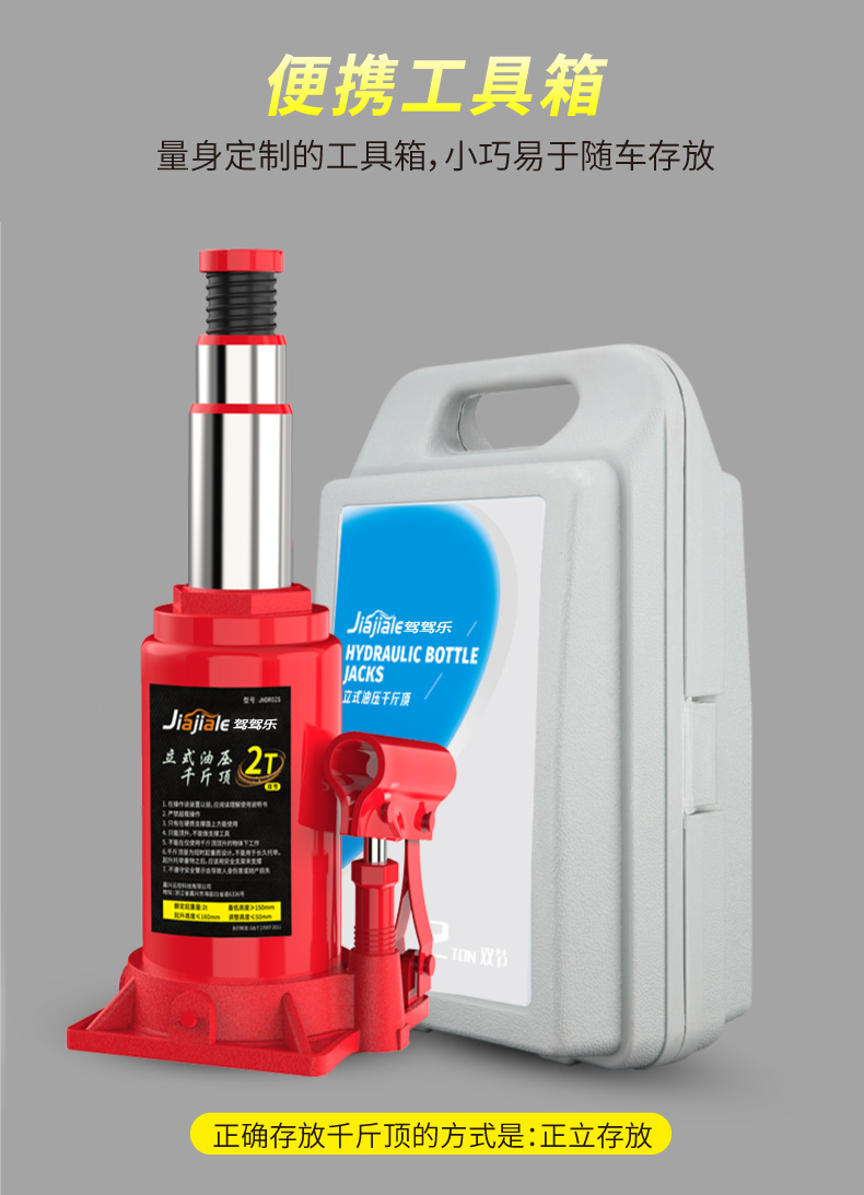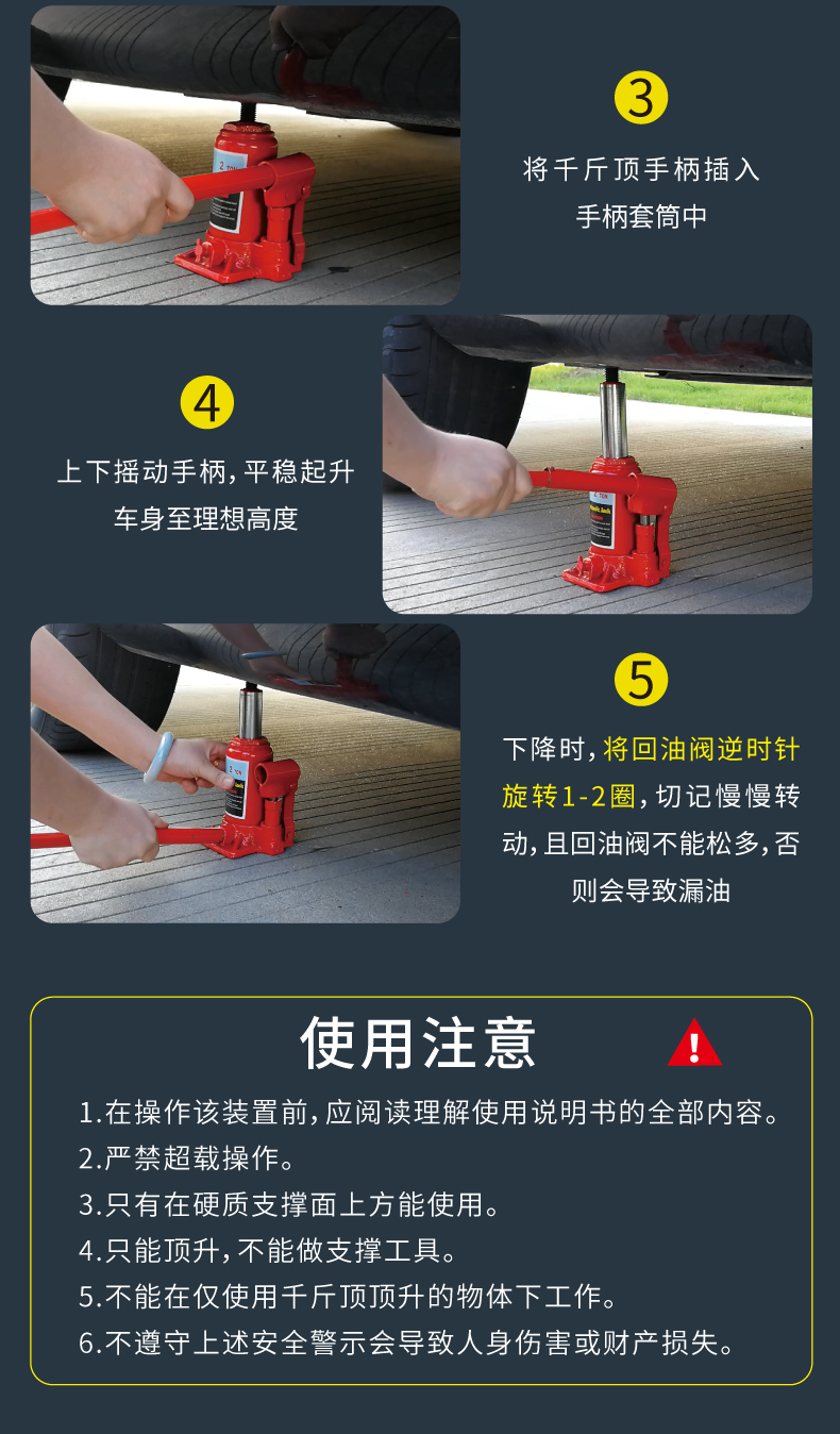 温馨提示:千斤顶是起升工具,不是支撑工具(需支撑车辆建议使用保安支架)。在起升车辆时,一次只能用一个千斤顶!使用两个及以上千斤顶起升同一辆车会导致千斤顶受力不垂直和不平衡,造成千斤顶的损坏。不遵守以上提示造成产品的损坏属于人为因素,由此导致的财产损失或者人身伤害由使用者自行承担!