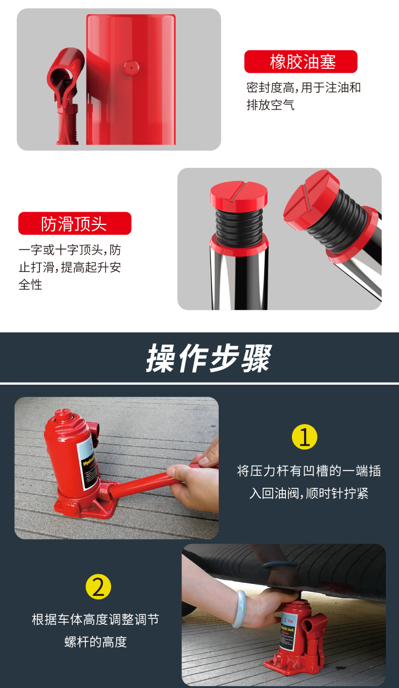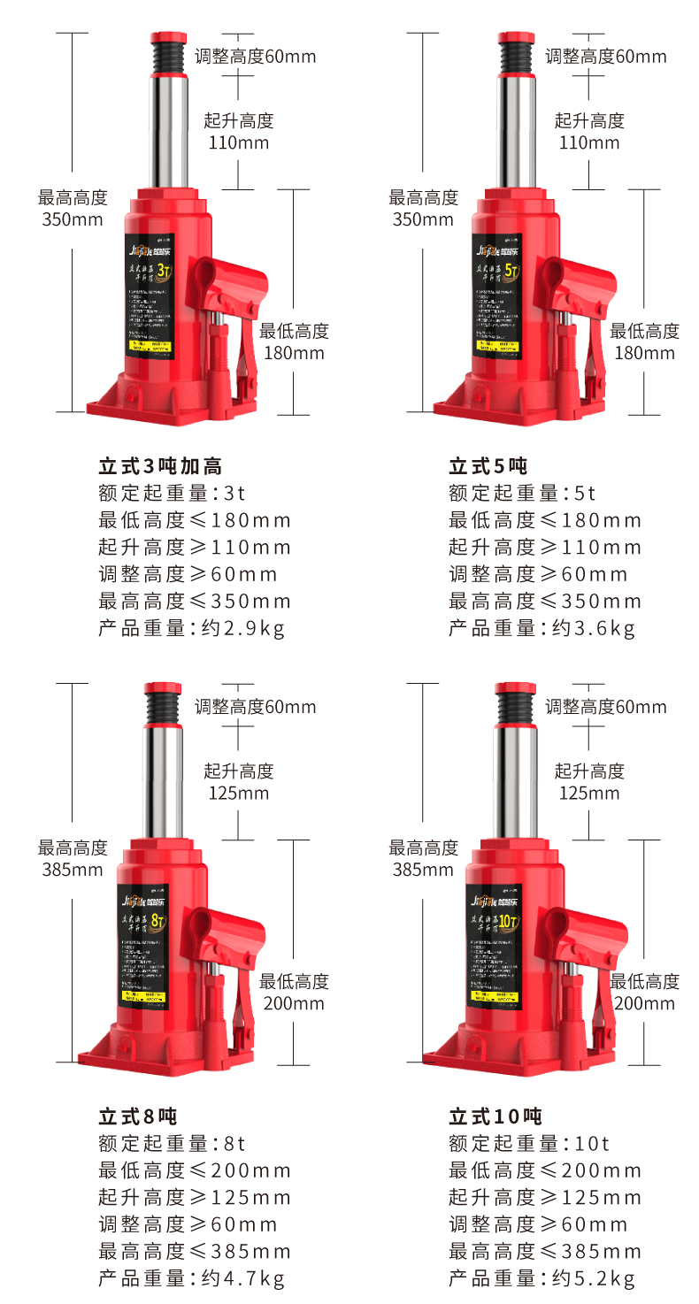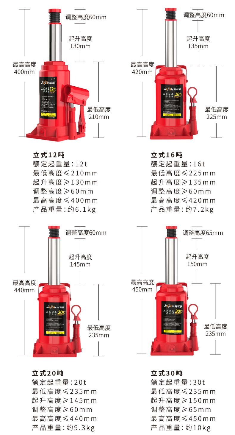 温馨提示:千斤顶是起升工具,不是支撑工具(需支撑车辆建议使用保安支架)。在起升车辆时,一次只能用一个千斤顶!使用两个及以上千斤顶起升同一辆车会导致千斤顶受力不垂直和不平衡,造成千斤顶的损坏。不遵守以上提示造成产品的损坏属于人为因素,由此导致的财产损失或者人身伤害由使用者自行承担!