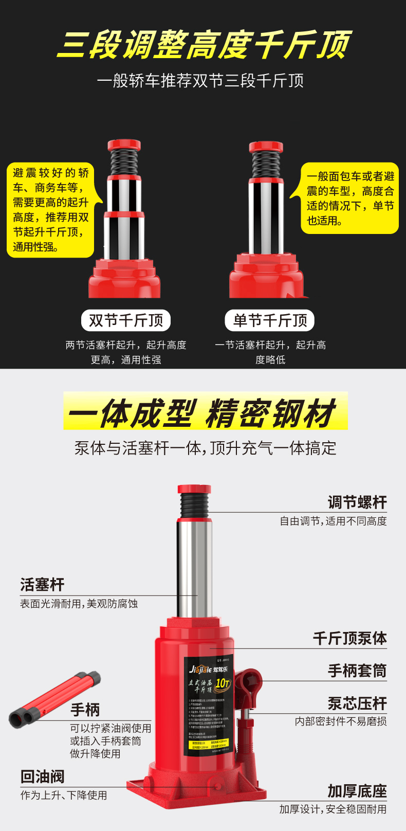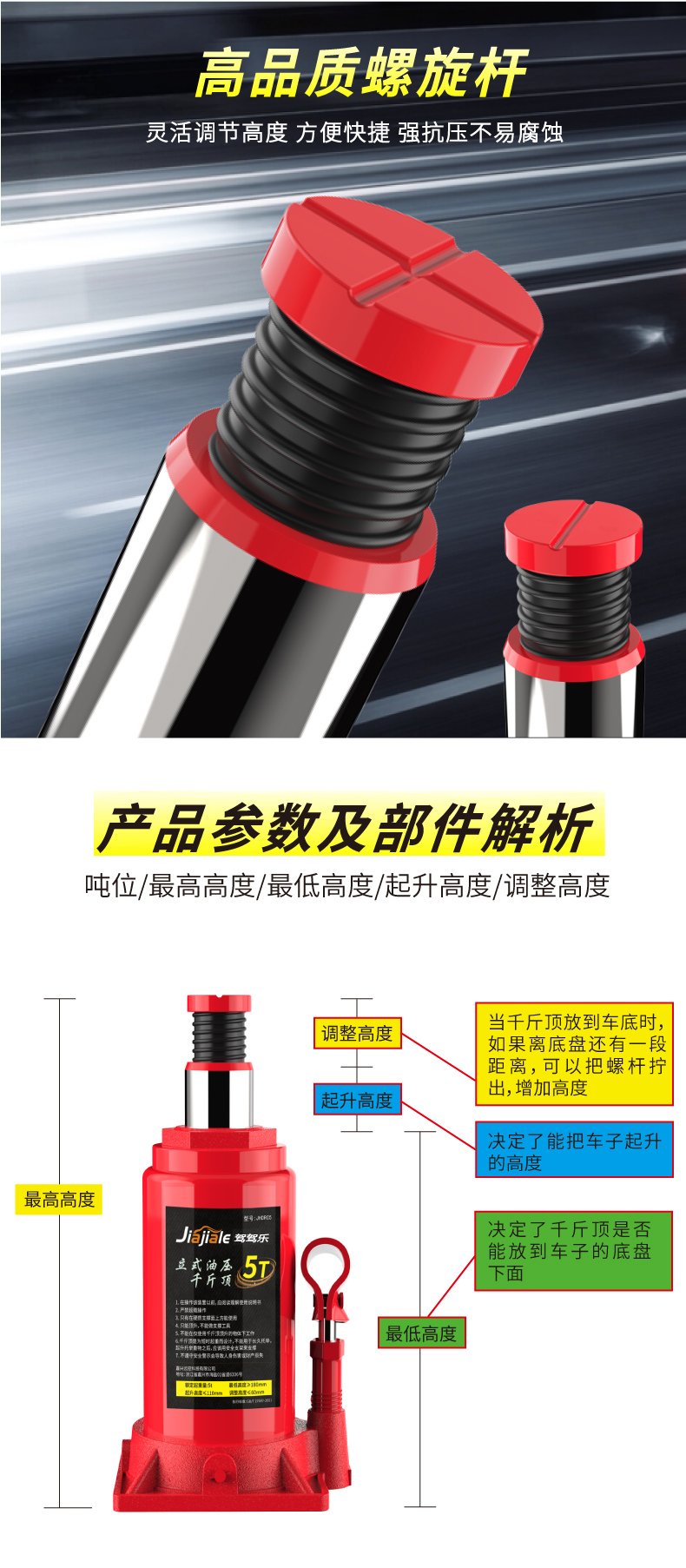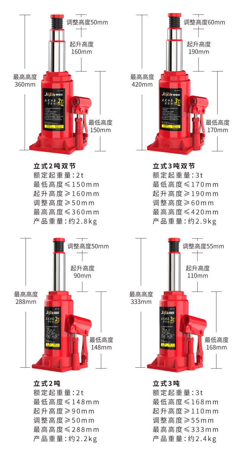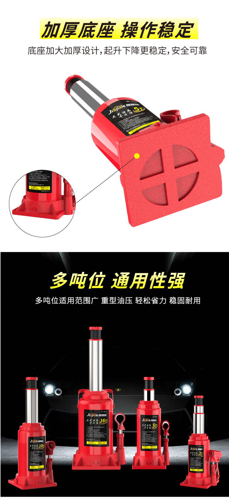温馨提示:千斤顶是起升工具,不是支撑工具(需支撑车辆建议使用保安支架)。在起升车辆时,一次只能用一个千斤顶!使用两个及以上千斤顶起升同一辆车会导致千斤顶受力不垂直和不平衡,造成千斤顶的损坏。不遵守以上提示造成产品的损坏属于人为因素,由此导致的财产损失或者人身伤害由使用者自行承担!