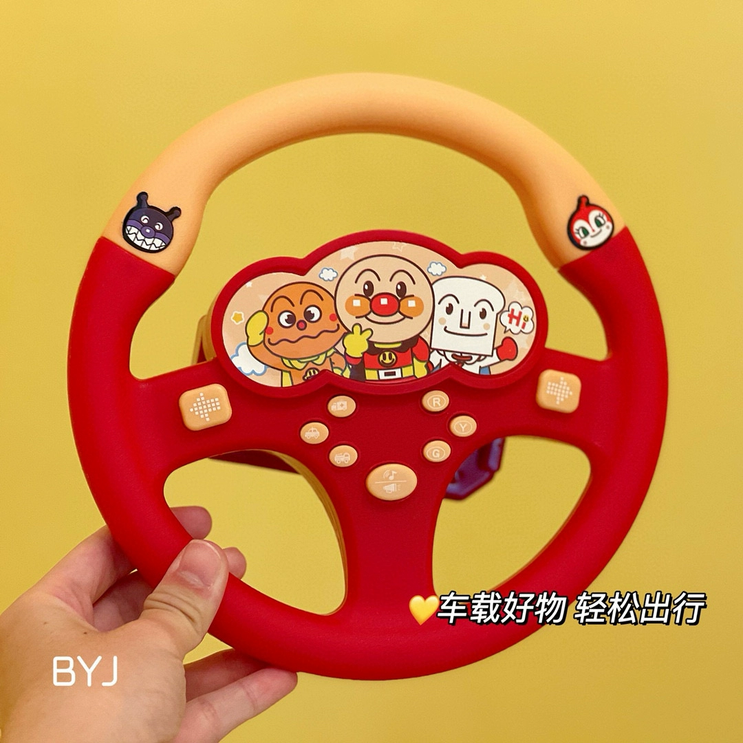 面包超人仿真副驾驶方向盘,带音乐音效哦,刹车音效,警车音效,救护车音效,消防车音效…超级仿真,方向盘背面有强力吸盘,可以吸附在餐桌上,瓷砖上玩耍哦