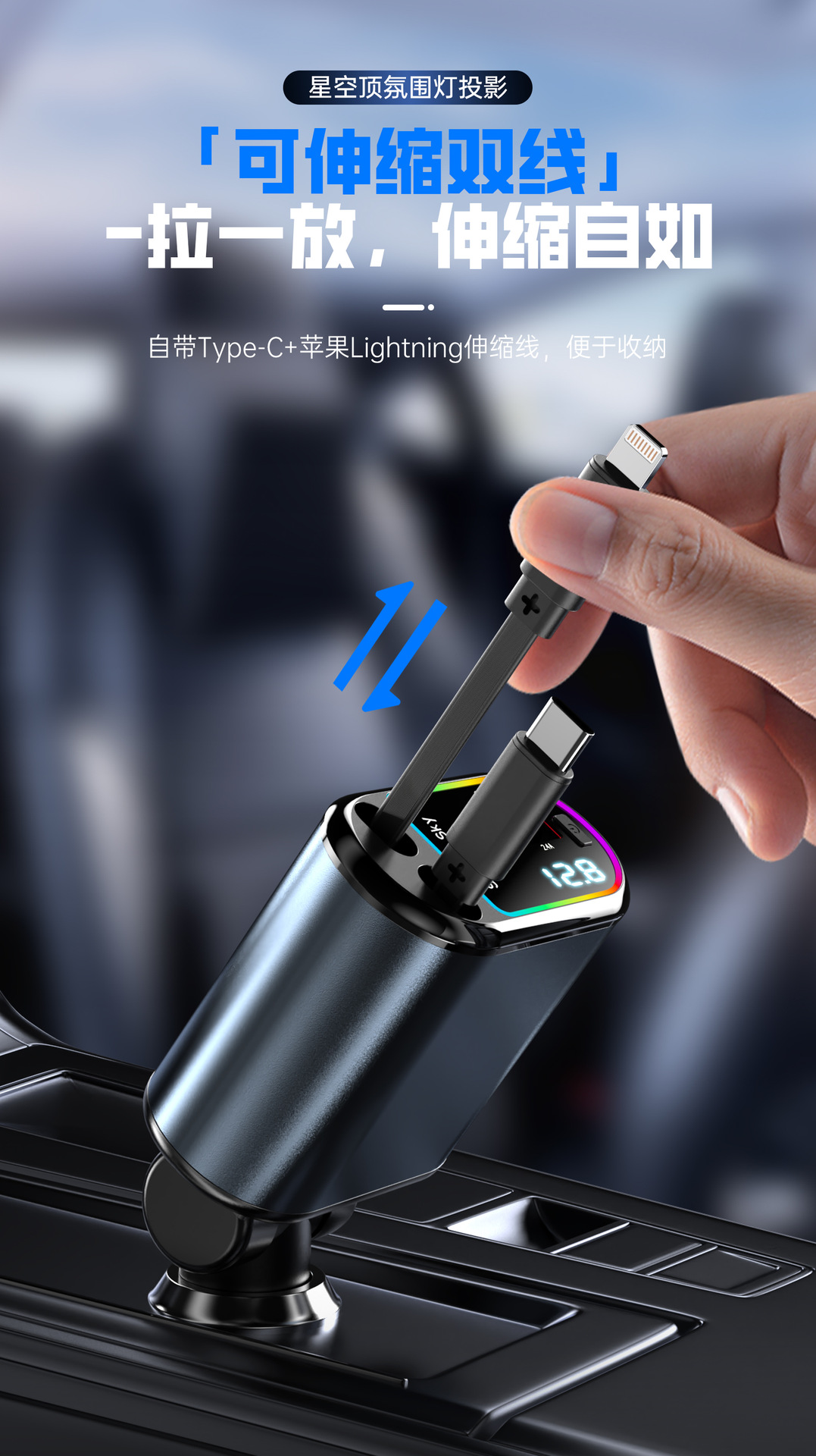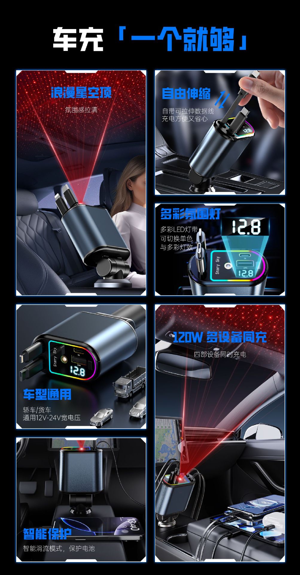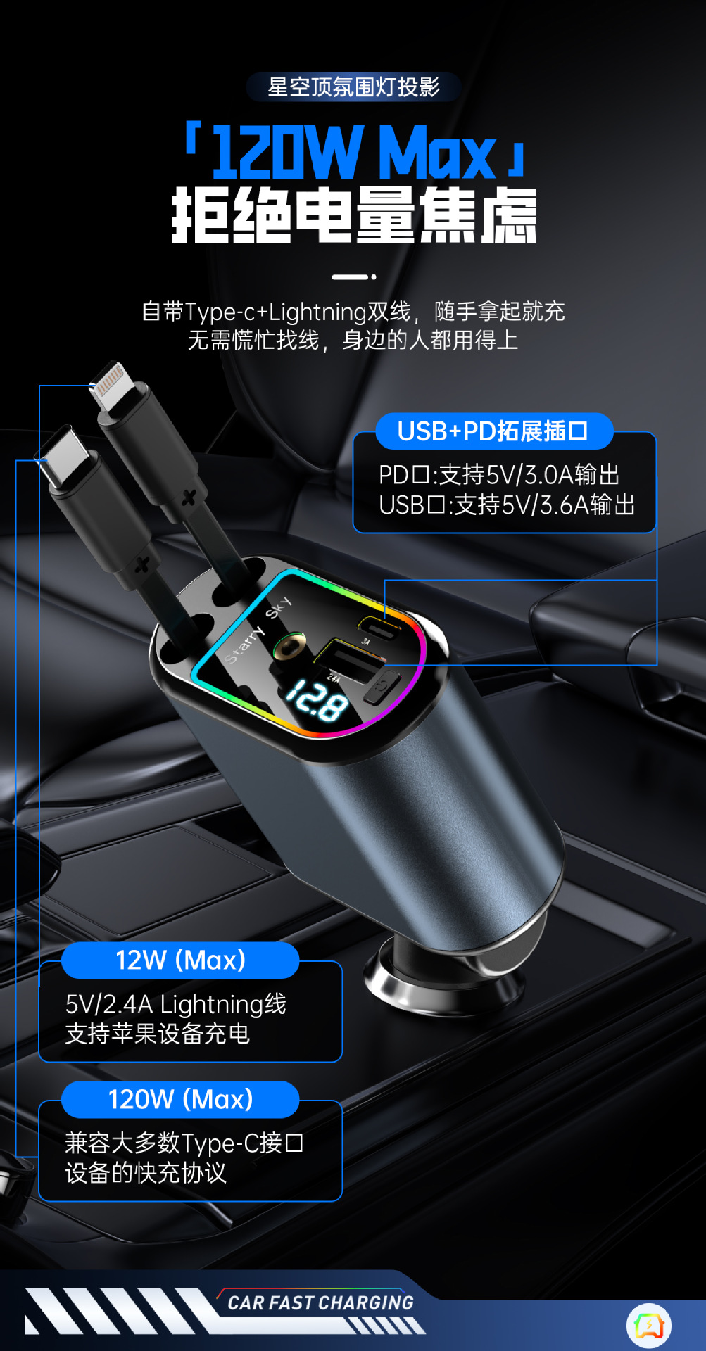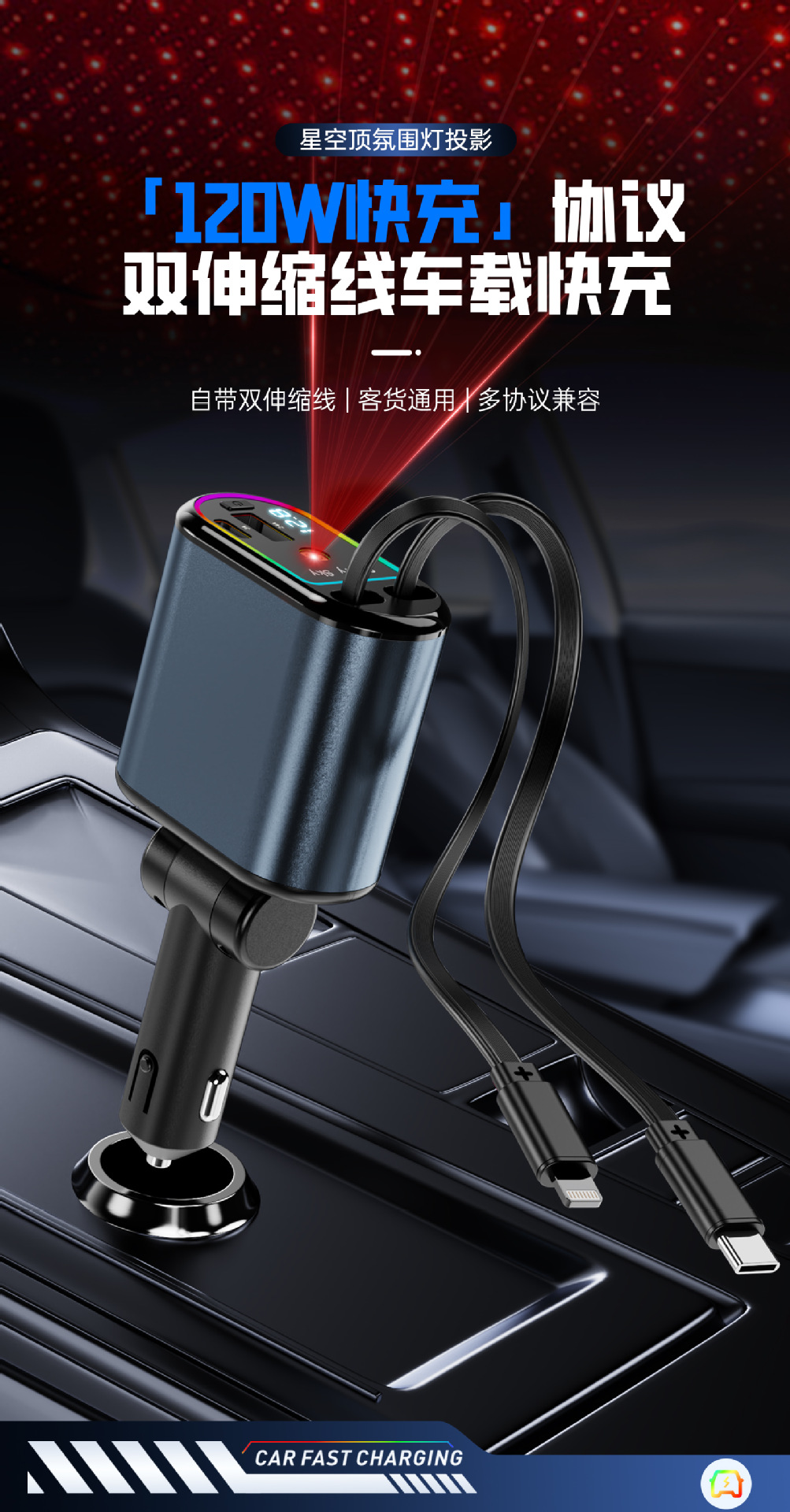 Многофункциональный цифровой дисплей с подсветкой звездного неба, сверхбыстрая зарядка, 120 Вт, втягивающийся автомобильный кабель, автомобильное зарядное устройство «четыре в одном» из металла