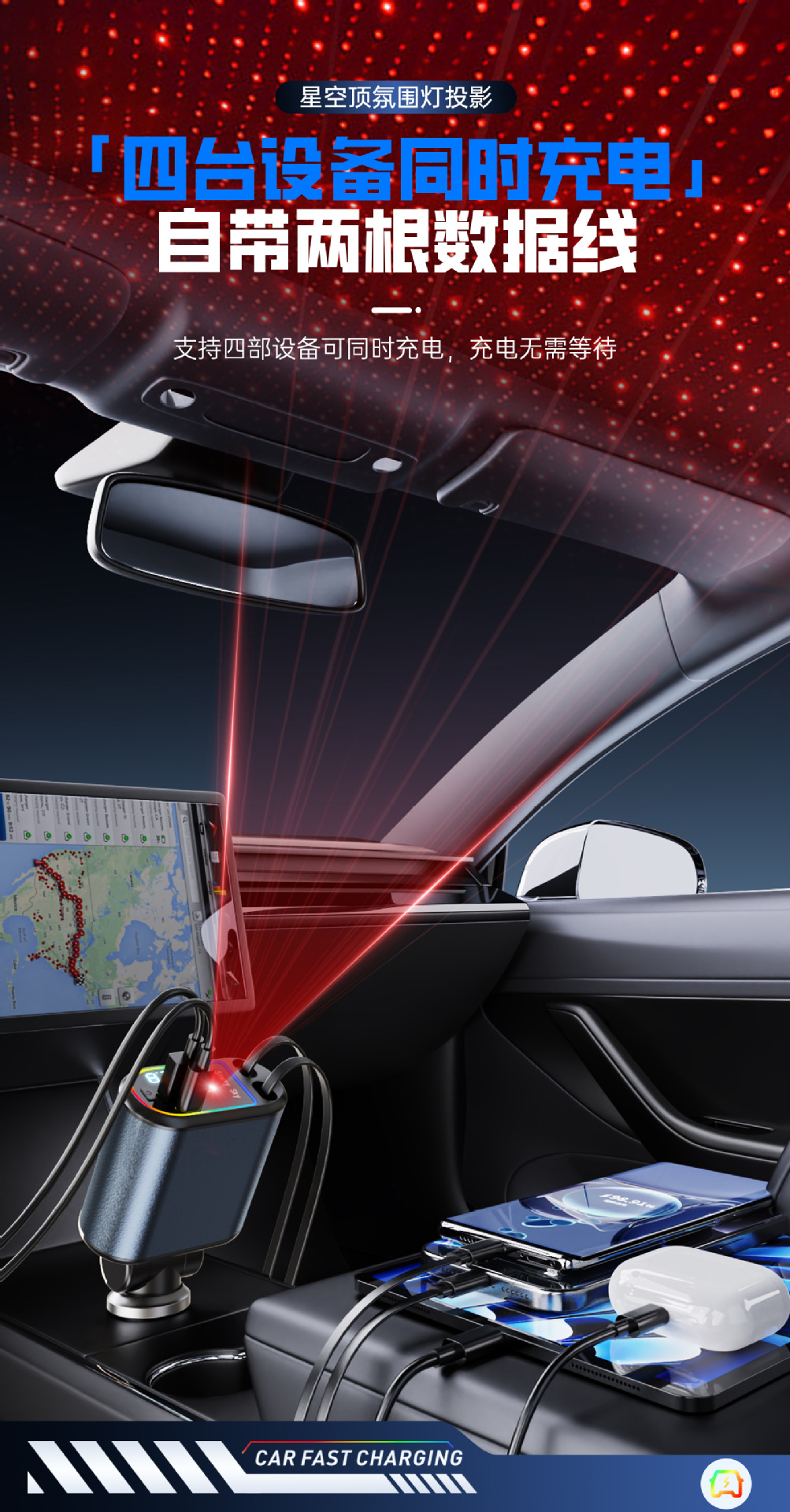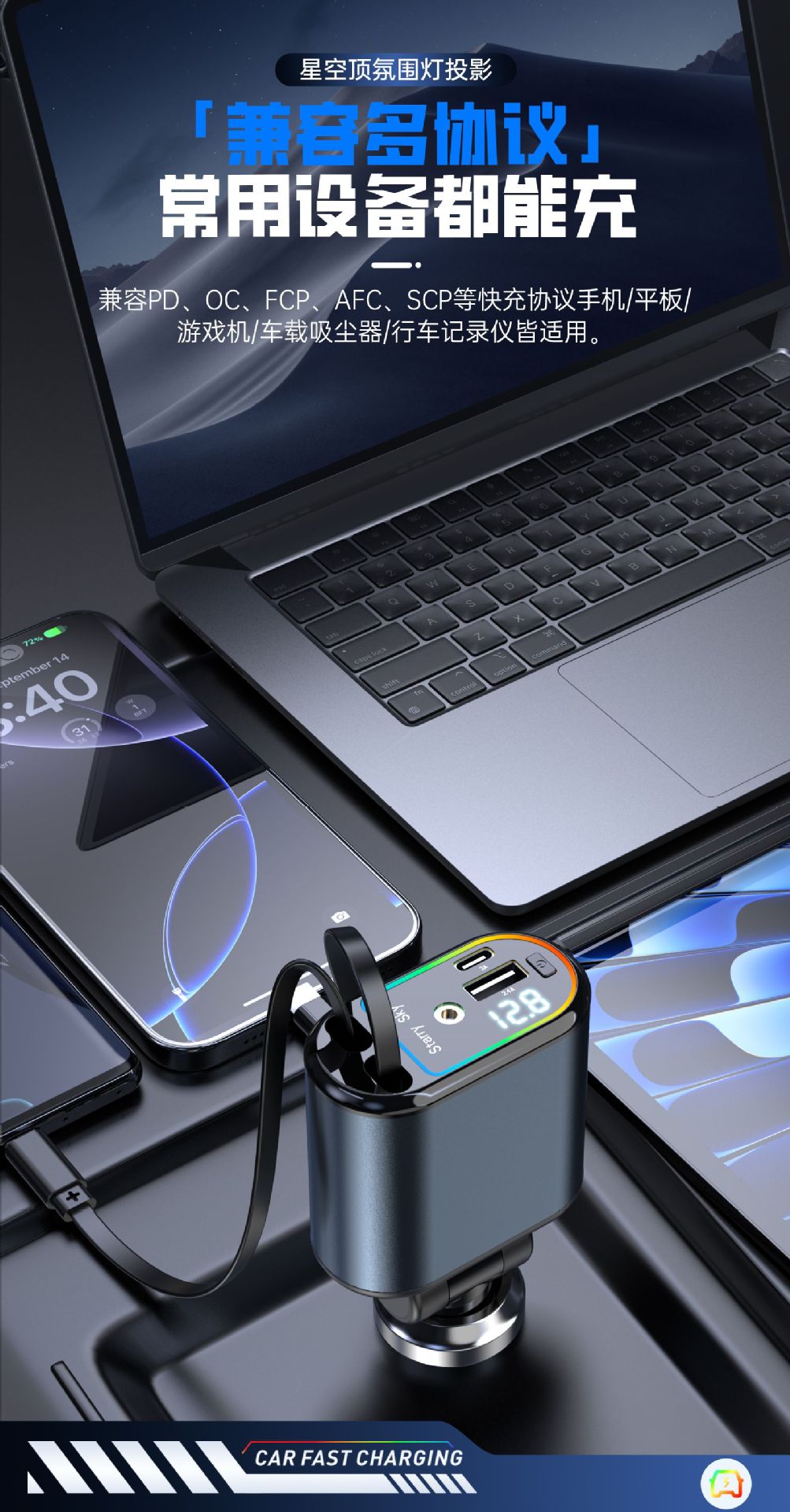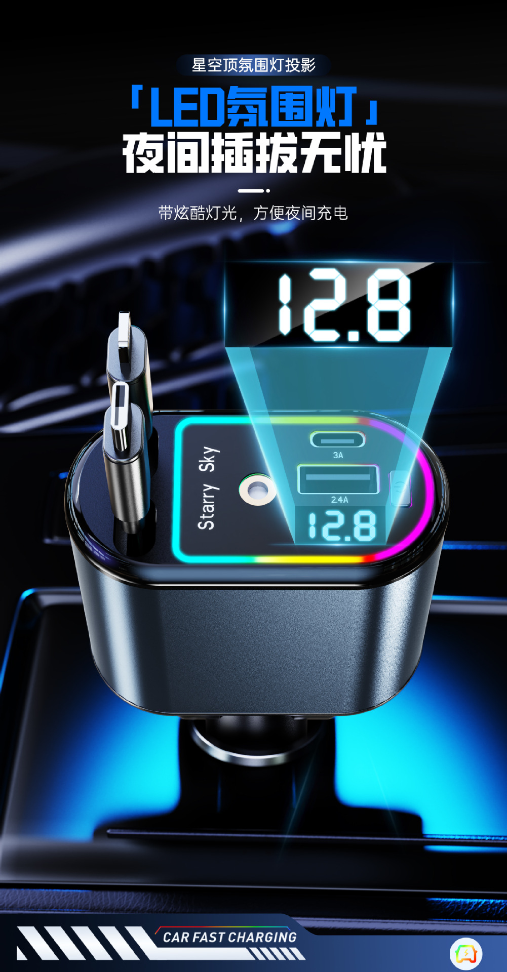 Многофункциональный цифровой дисплей с подсветкой звездного неба, сверхбыстрая зарядка, 120 Вт, втягивающийся автомобильный кабель, автомобильное зарядное устройство «четыре в одном» из металла