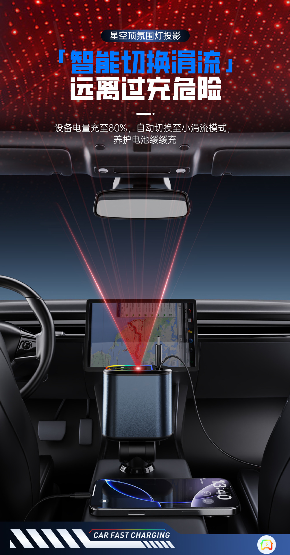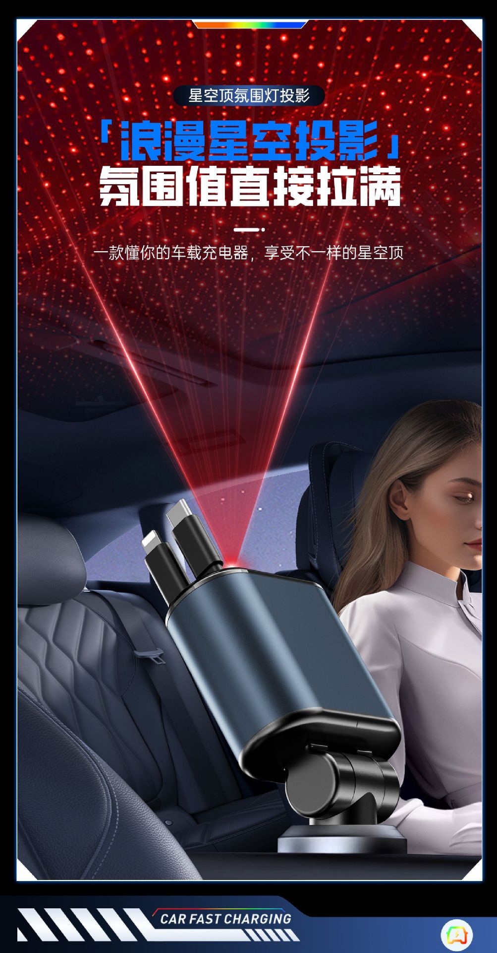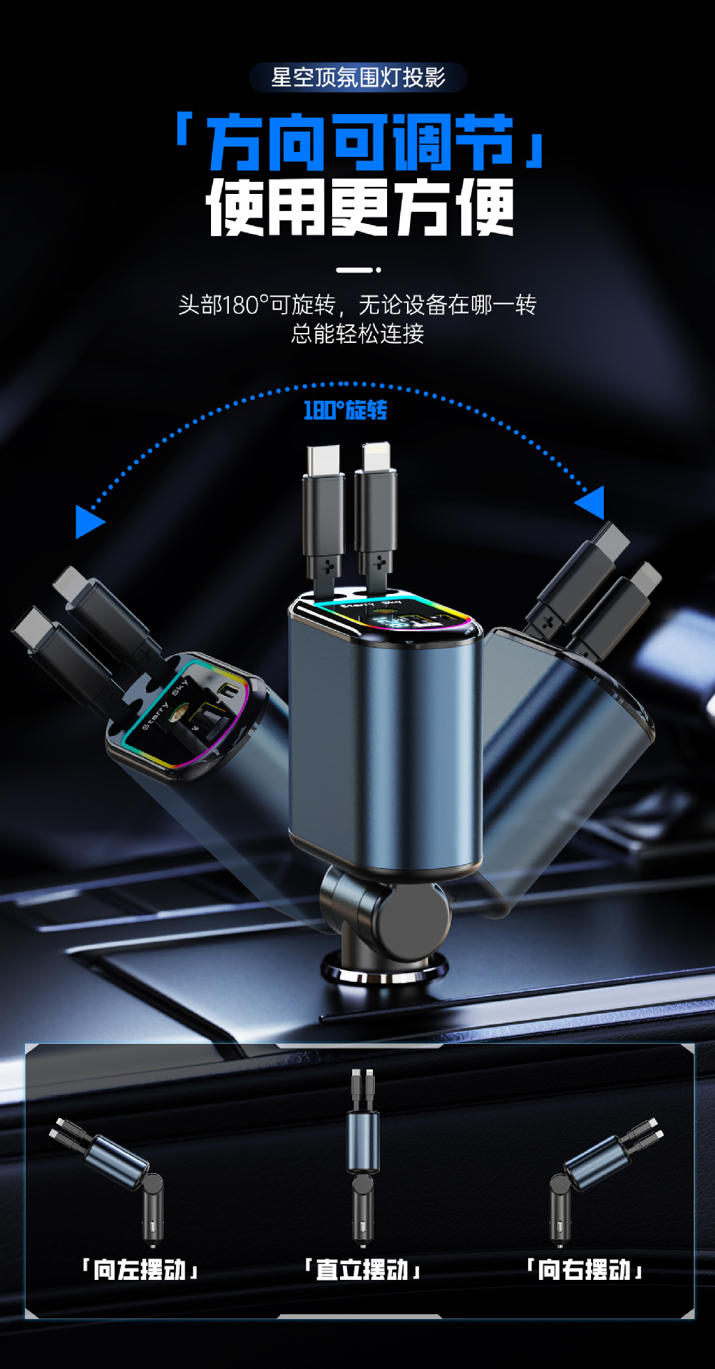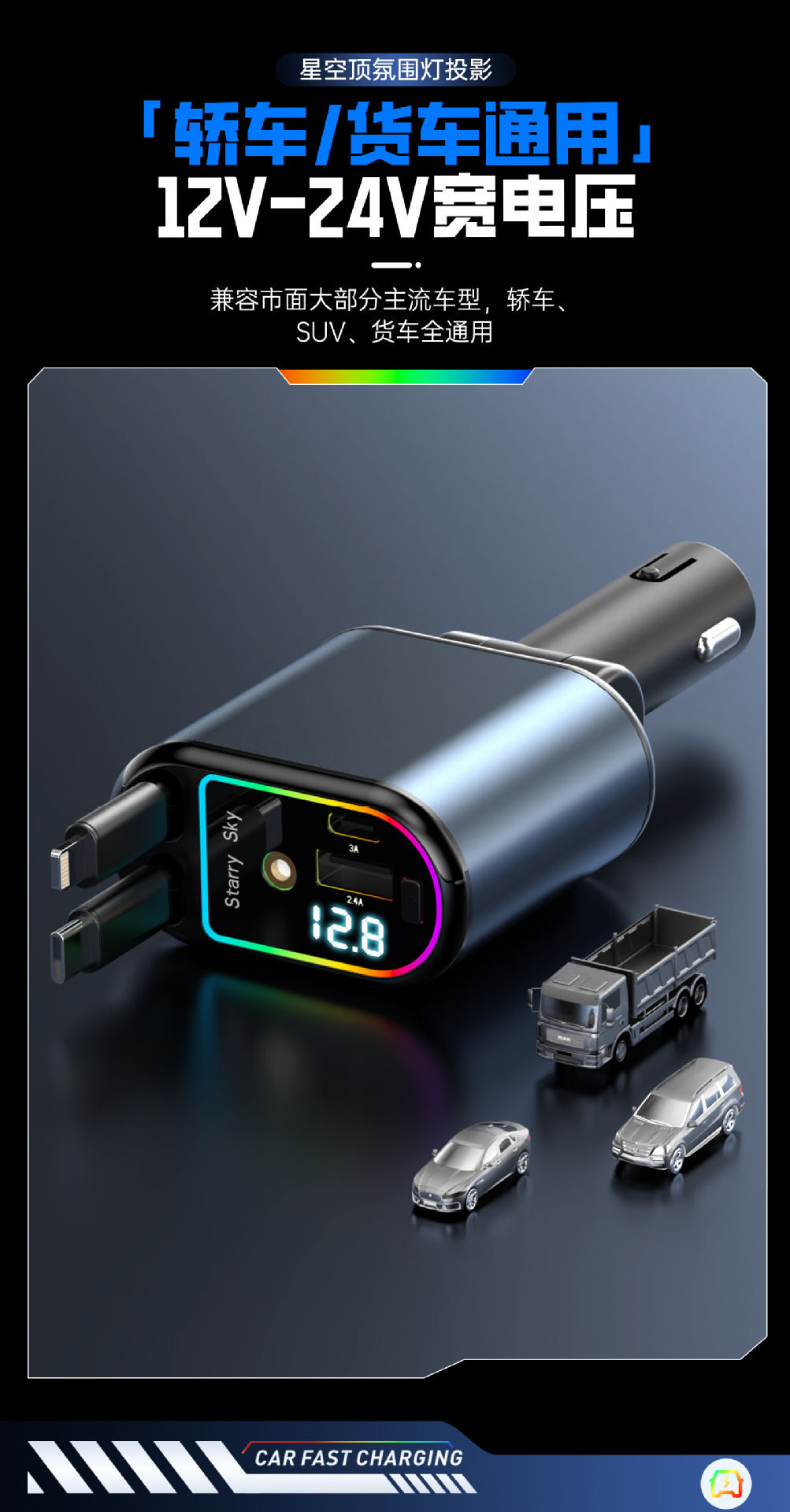 Многофункциональный цифровой дисплей с подсветкой звездного неба, сверхбыстрая зарядка, 120 Вт, втягивающийся автомобильный кабель, автомобильное зарядное устройство «четыре в одном» из металла