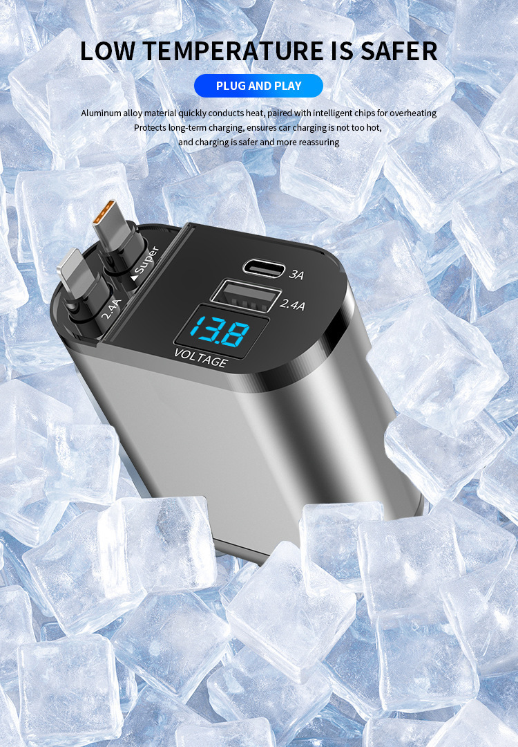 ДомМагазинАвтомобильное зарядное устройствоНовое зарядное устройство с выдвижным кабелем для автомобиля, 120 Вт, быстрая зарядка от прикуривателя, быстрая зарядка, выдвижной кабель, четыре в одном, Huawei Super