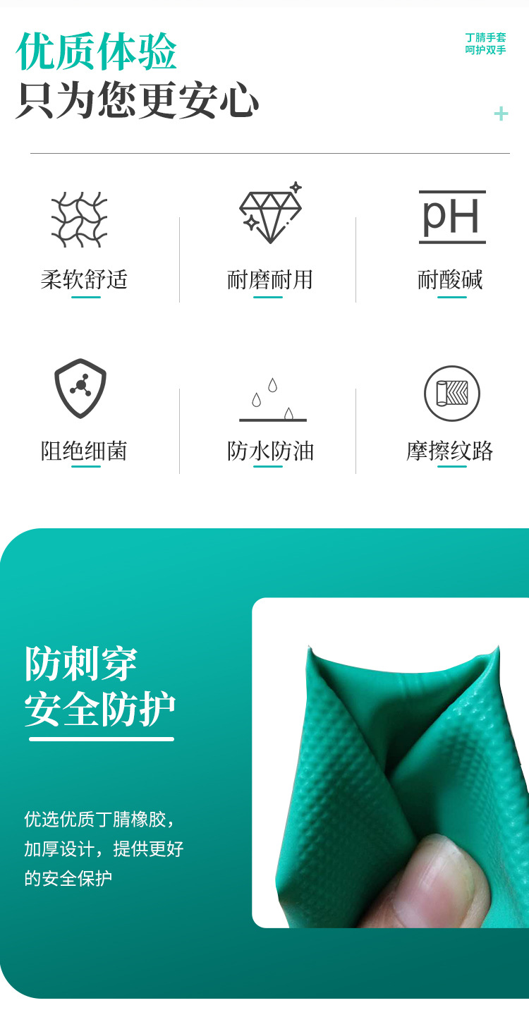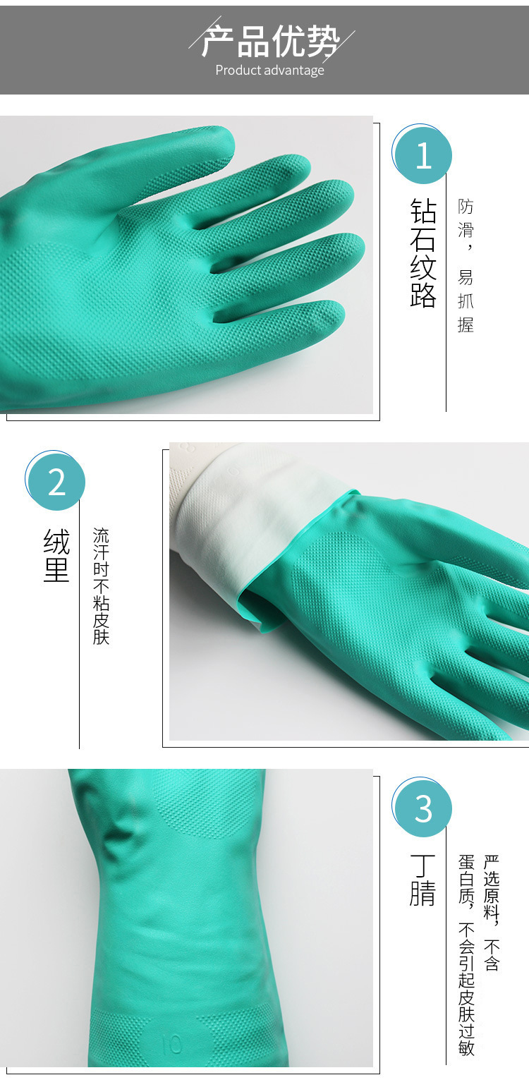 【特性】:柔软舒适、弹性好、耐撕裂,防滑耐磨、防油渍、耐酸碱.