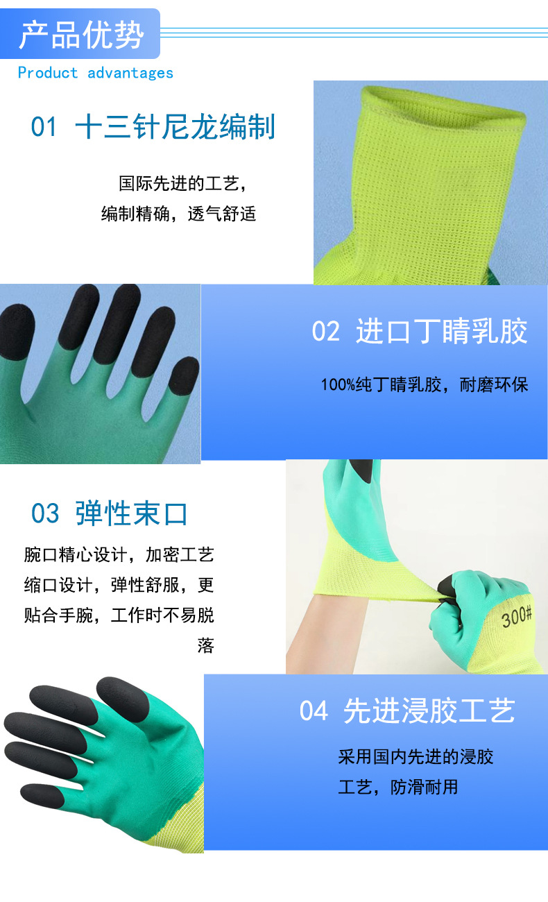 | Технические характеристики | Махровая пена (теплая и износостойкая), дышащая зеленая манжета (удобная и износостойкая), тисненый латекс (суперизносостойкая), резина для шин (суперизносостойкая), белый и синий чистый нитрил (суперизносостойкая), зелено-черная пена (удобная и износостойкая), резина для шин (удобная и износостойкая) |