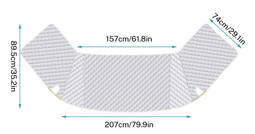 四季保护:RV 挡风玻璃罩由 4 层高密度材料制成。 PEVA 镀铝膜+棉 + 阻燃棉 + 黑色涤纶,具有防水功能,提供隔热和寒冷绝缘。 可阻挡 99% 的紫外线,降低内部温度的 10 度。 防雪、冰霜、灰尘、污垢。