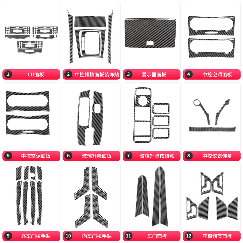 | цвет | Левая и правая рамки воздуховодов, декоративные накладки на центральной консоли, панель кнопок CD на центральной консоли (тип A), крышка прикуривателя, панель кнопок CD на центральной консоли (тип C), панель кнопок CD на центральной консоли (тип B), панель с бачком для воды (чисто черная), панель кнопок стеклоподъемников, декоративные наклейки на внутренние ручки дверей, декоративная рамка переключателя фар, рамка воздуховода центральной консоли, декоративные наклейки на внутреннюю часть чаши двери, декоративные наклейки на брови фар, ящик для хранения передач на центральной консоли (набор из 7 предметов), декоративные наклейки на воздуховоды приборов, декоративная рамка заднего воздуховода, декоративные наклейки на ручки ящика для хранения, декоративные наклейки на внешние ручки дверей, внутренняя рамка рычага переключения передач, декоративные наклейки на навигационную панель центральной консоли, декоративные наклейки на логотип рулевого колеса, декоративные наклейки на кнопку регулировки сиденья (тип A), декоративные наклейки на переключатель фар, декоративная рамка запуска одной кнопкой, декоративные накладки со стороны коробки передач, декоративные наклейки на кнопку регулировки сиденья (тип B), декоративные наклейки на кнопку регулировки сиденья (тип C), центральная панель управления кондиционером (тип C), центральная панель управления кондиционером (тип D), внешняя рамка рычага переключения передач, центральная панель управления кондиционером (тип A), декоративные наклейки на лампу для чтения, центральный Панель управления кондиционером (тип B), декоративные наклейки на задние фонари для чтения, панель с бачком для воды (трехцветная версия), нижняя надпись на рулевом колесе, декоративные наклейки на центральную панель управления CD, декоративные накладки на зеркала заднего вида, декоративные наклейки на дверные панели, панель кнопок стеклоподъемников |
