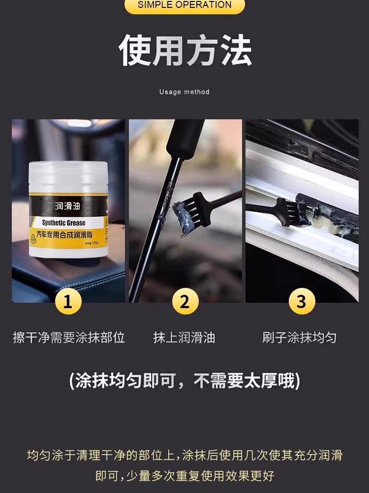 ДомМагазинАгент по техническому обслуживаниюСмазка для автомобильных дверей, средство для ухода за петлями, смазка направляющих люка, средство против заклинивания, средство для снижения шума и средство для ухода за резиновыми полосками.