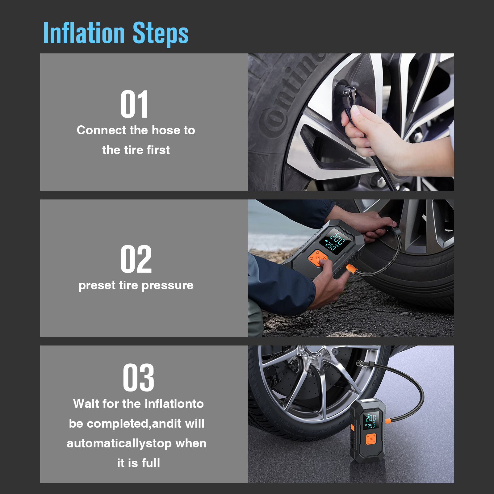 附带功能 : 1.无线充气 2.检测胎压 3.应急照明 4.sos急救灯5.充电宝