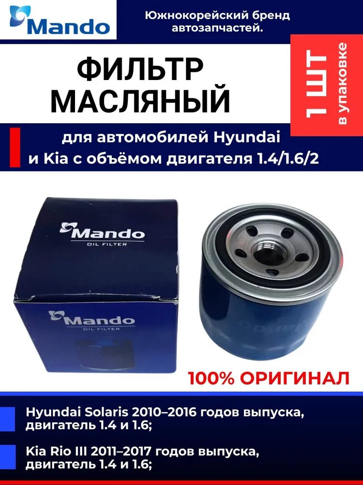 Фильтр масляный для Hyundai Хендай Creta Крета, Solaris Солярис, Kia Киа Rio Рио, Sportage Спортейдж, Mando MOF4459. Оригинальный номер 2630035505