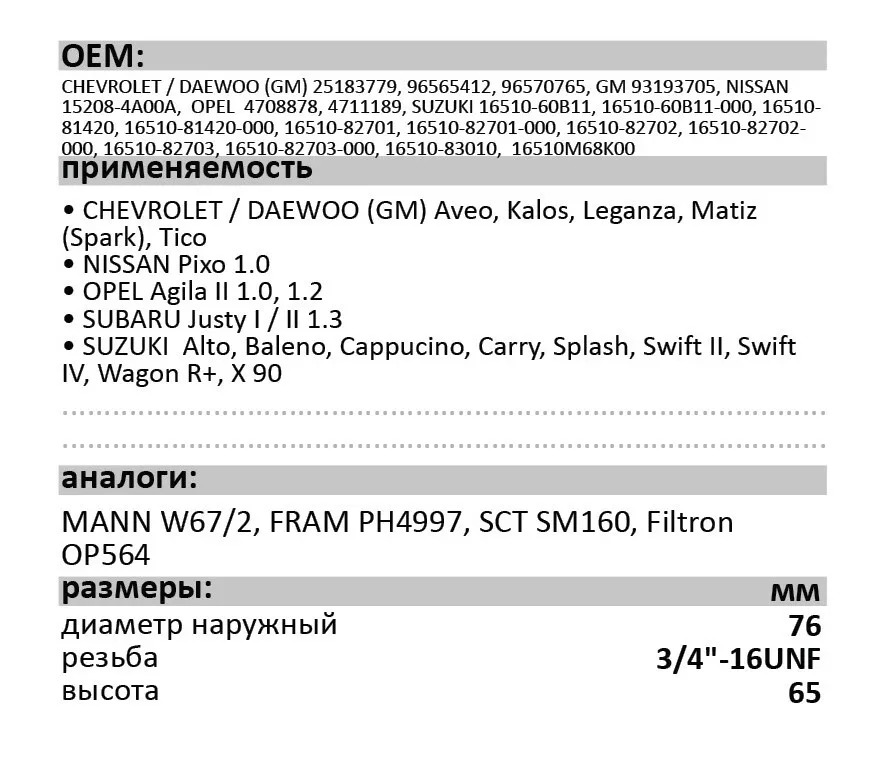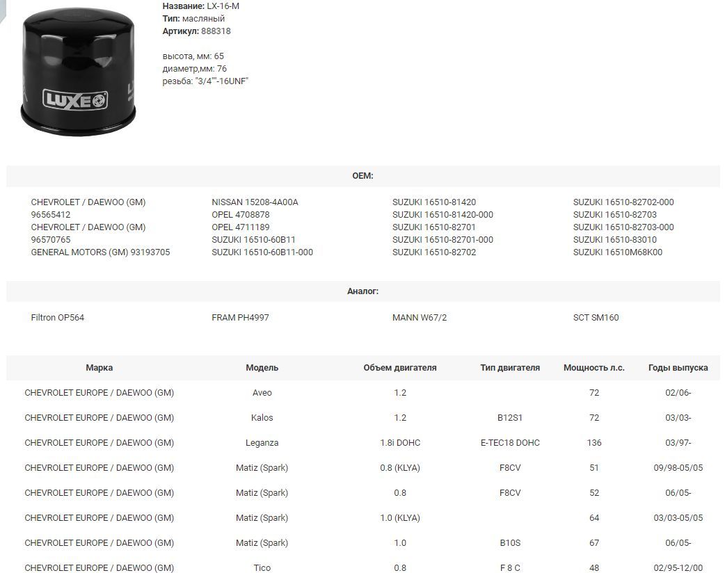 Добавить в список желаний Добавить к сравнениюФильтр масляный DAEWOO, CHEVROLET, SUZUKI (аналог W67/2), NISSAN, OPEL, LUXE LX-16-M