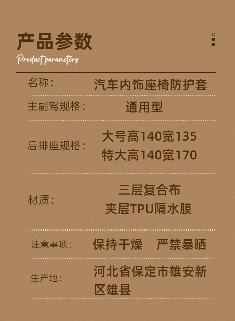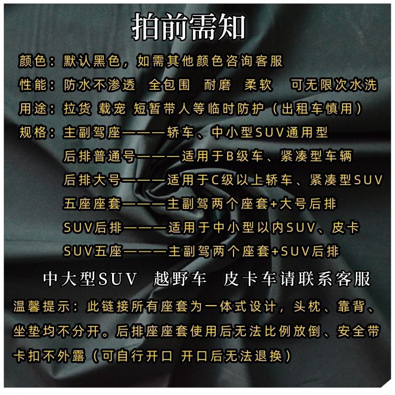 | Характеристики продукта | Чехлы на задние трехместные сиденья внедорожника (полностью закрытые передние и задние сиденья), чехлы на пятиместные сиденья внедорожника (полностью закрытые передние и задние сиденья), чехлы на задние трехместные сиденья большого внедорожника/пикапа, большие задние сиденья (седаны C-класса и выше), отдельный чехол на водительское сиденье, чехол на пассажирское сиденье + чехлы на задние трехместные сиденья внедорожника, чехол на пассажирское сиденье + чехлы на большие задние трехместные сиденья, чехол на пассажирское сиденье + чехлы на задние трехместные сиденья, чехлы на задние трехместные сиденья, чехлы на пятиместные сиденья (два передних + три задних), чехлы на сиденья водителя и пассажира. |