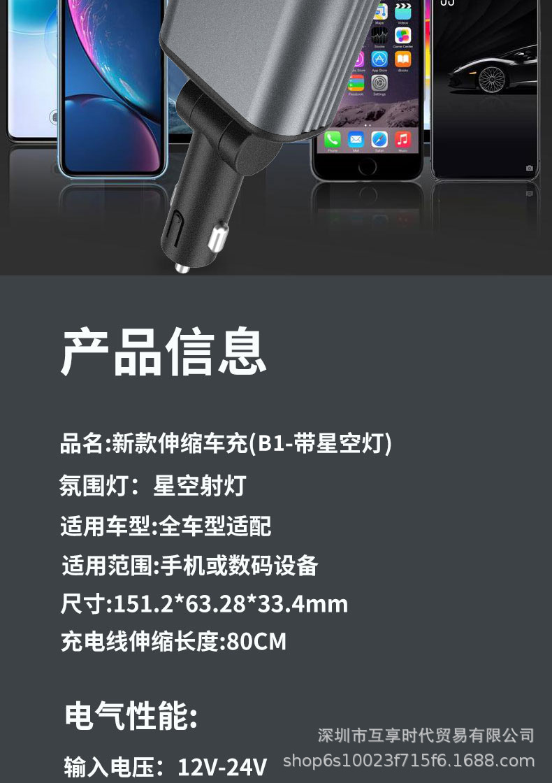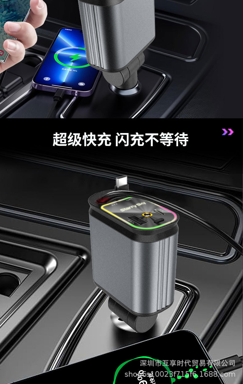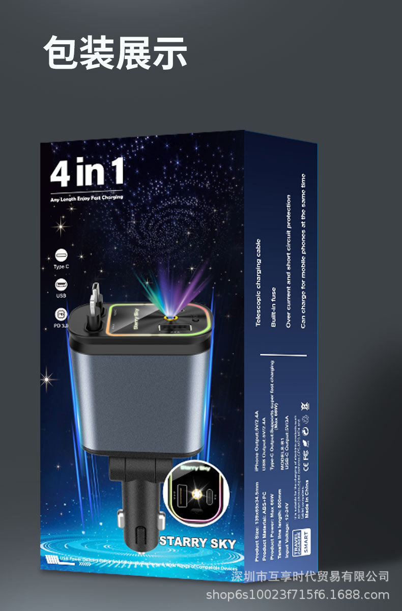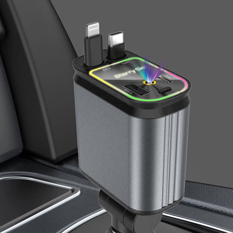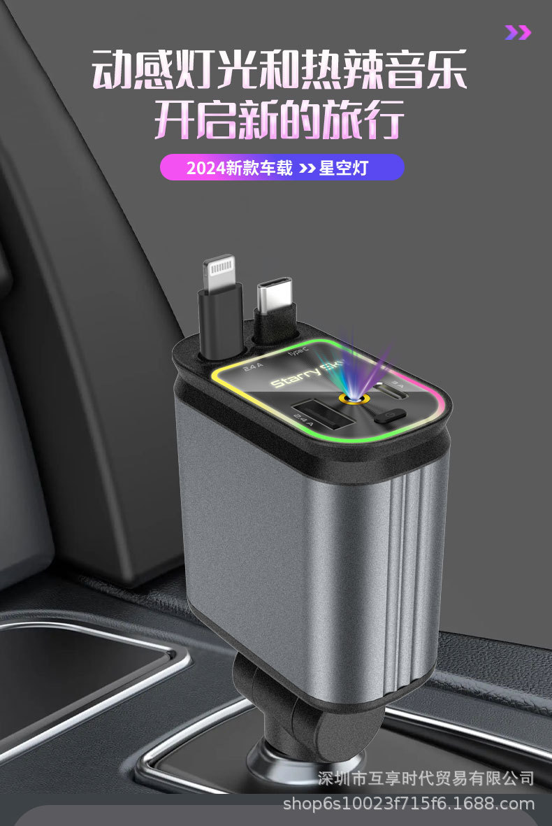ДомМагазинАвтомобильное зарядное устройствоЭксклюзивное трансграничное автомобильное зарядное устройство для мобильного телефона 4 в 1, многофункциональное, выдвижной кабель, проекция звездного неба, зарядная вспышка, новый