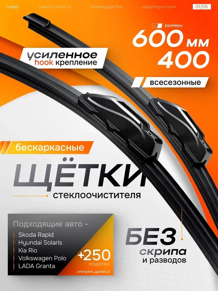 600 400 мм.Крепление крючок. Бескаркасные щетки стеклоочистителя. Шкода Рапид Skoda Rapid, Hyundai Solaris Хендай Солярис, Kia Rio Киа Рио, Volkswagen Polo Фольксваген Поло, LADA Granta Лада Гранта