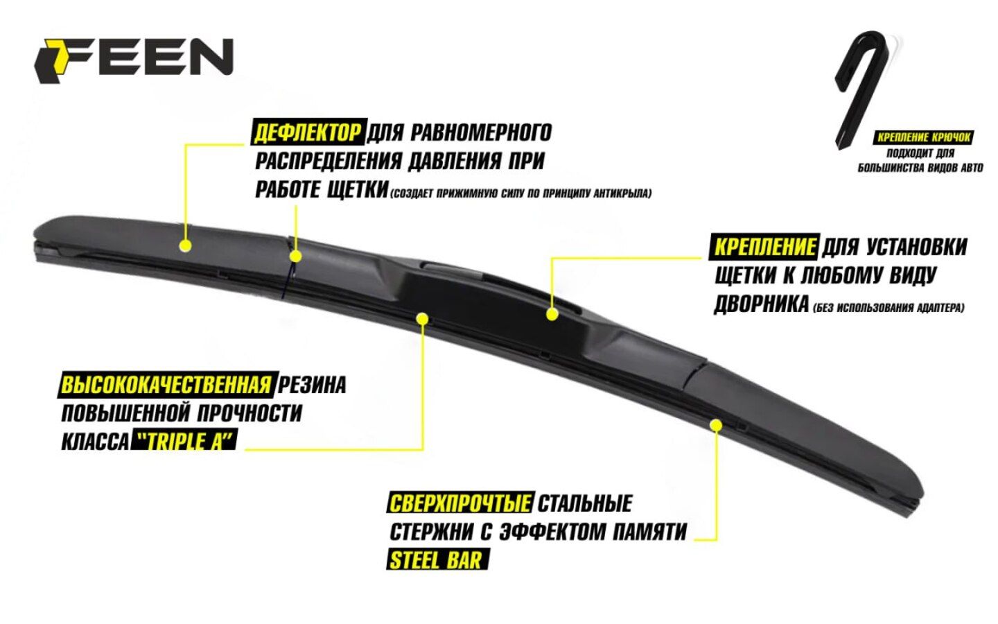 Щетки стеклоочистителя комплект длиной 60 и 40 см. Крепление — крючок. Дворники для автомобиля всесезонные. Износостойкость, бесшумная работа автоаксессуара. Гибридные щетки представляют собой конструкцию, сочетающую в себе стандартный каркас из шарниров и коромысел от каркасного дворника с пластиковым спойлером от бескаркасного. За счет этого достигается максимально высокое качество очистки. Щетки гибрид для авто способны обеспечить плотное взаимодействие со стеклом любого профиля. Аэродинамический профиль кожуха дает отличное прилегание к лобовому стеклу, конструкция надежная, служит долго. Щетки автомобильные чистят без разводов. Износостойкость, бесшумная работа автоаксессуара — до 1 500 000 махов без ухудшения качества очистки. Плотное прилегание к лобовому стеклу — аксессуары FEEN чистят без разводов. Все автотовары бренда FEEN универсальны в использовании и изготовлены из высококачественных материалов. Резинки с защитным графитовым покрытием уменьшают вибрацию во время чистки.