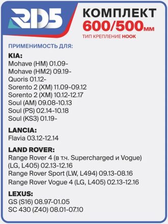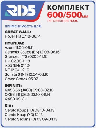 600 500мм. Крепление Hook. Комплект бескаркасных щеток стеклоочистителя RD5 дворники Kia Cerato Киа Церато Седан; Kia Soul Соул Kia Sorento Соренто; Hyundai Sonata Соната; Toyota Camry Тойота Камри;