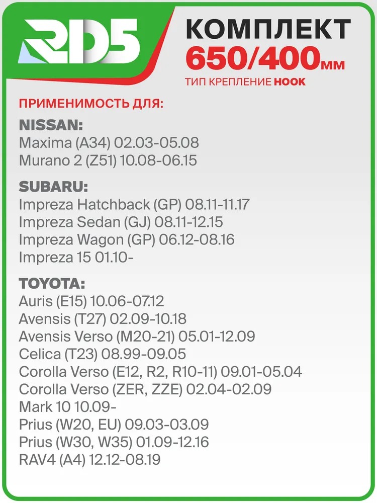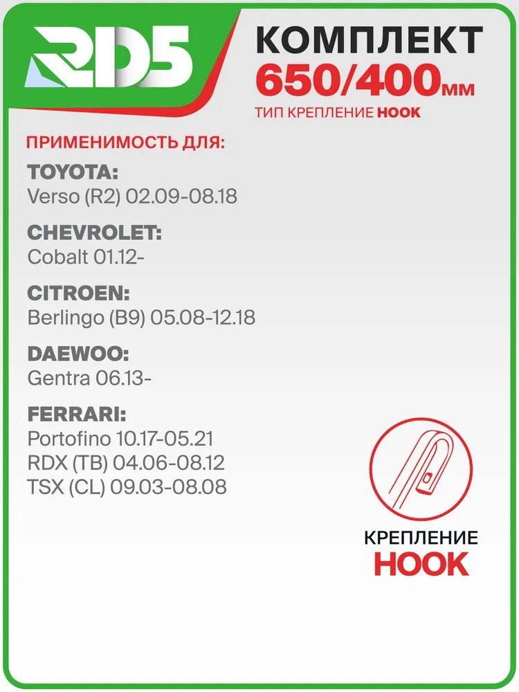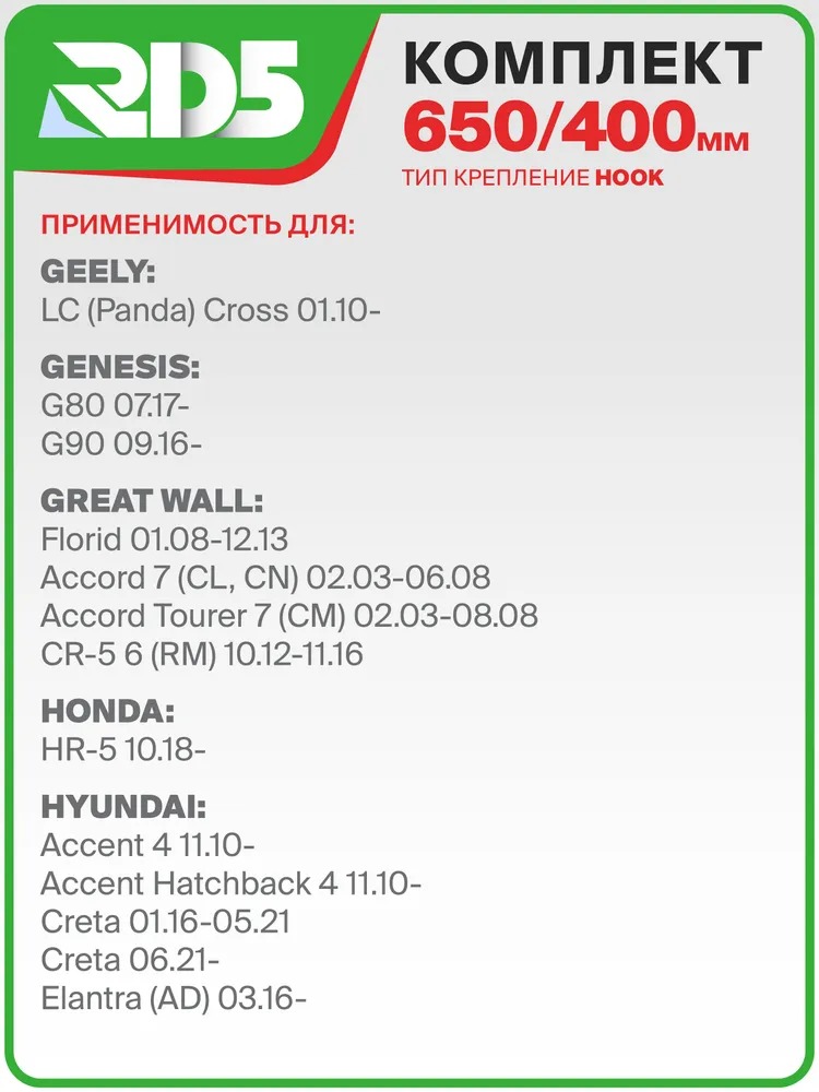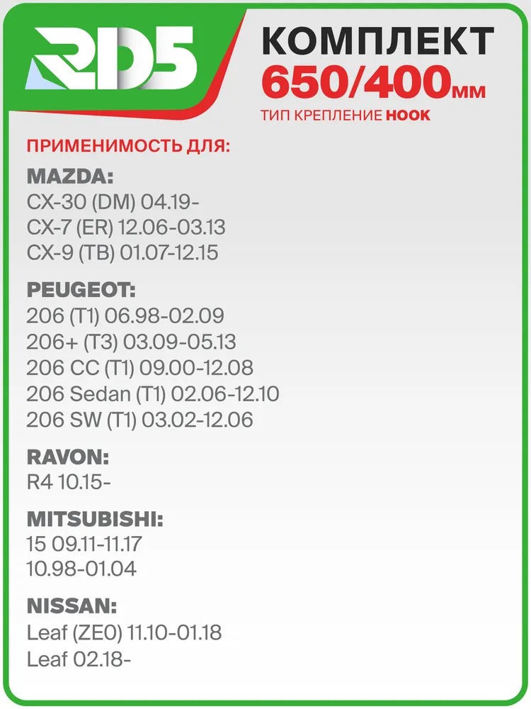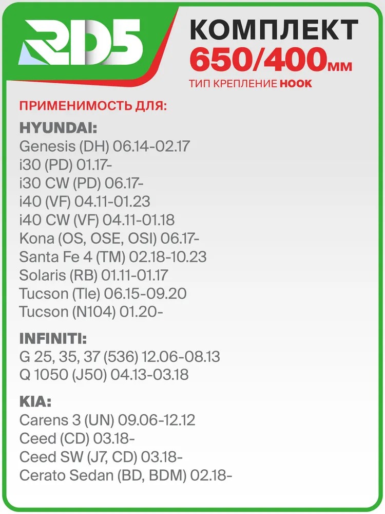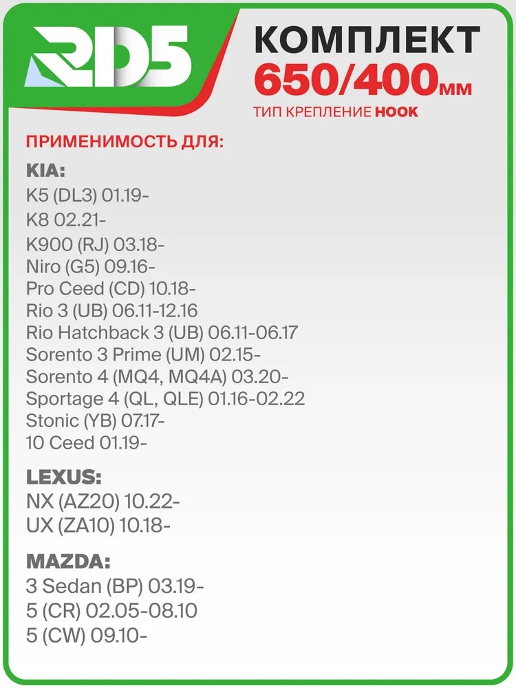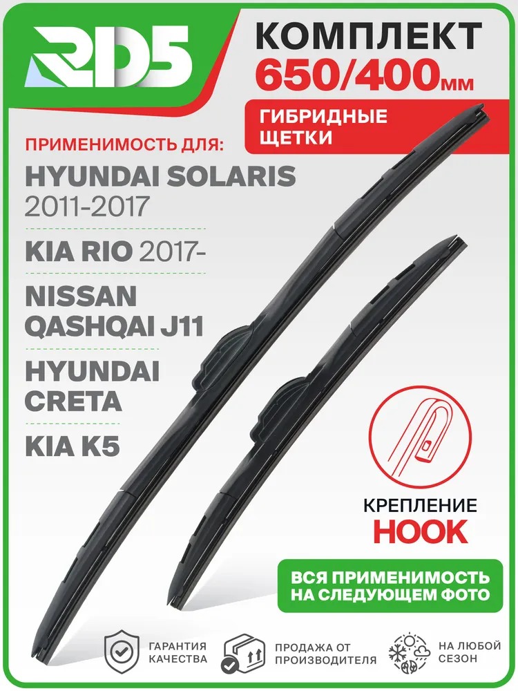 650 400мм. Комплект гибридных щеток стеклоочистителя RD5 Kia Rio Киа Рио; Hyundai Solaris; Хендай Солярис; Hyundai Creta; Хендай Крета; Mazda CX-7 Мазда