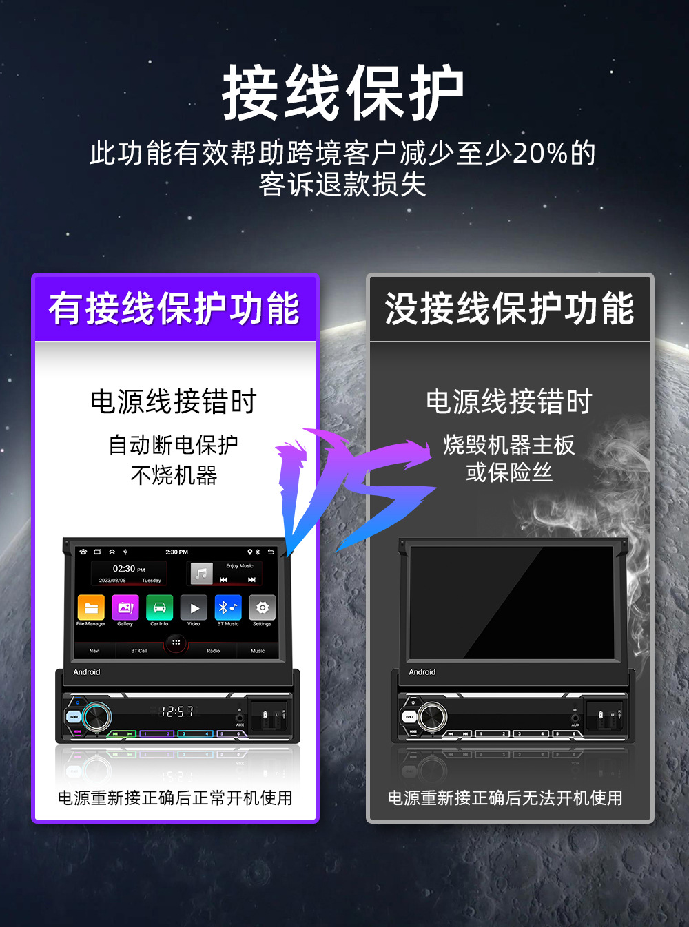 ♦接线保护功能直接帮跨境客户减少至少20%客诉退款损失(跨境客户零售到国外,客人自己安装接线,正负极分不清接错时候正常会直接烧坏机器主板或者保险丝,导致客诉退货或者差评,我司最新研发此产品电源线随便接N次都不会烧机器和保险丝,直到客户接对为止)