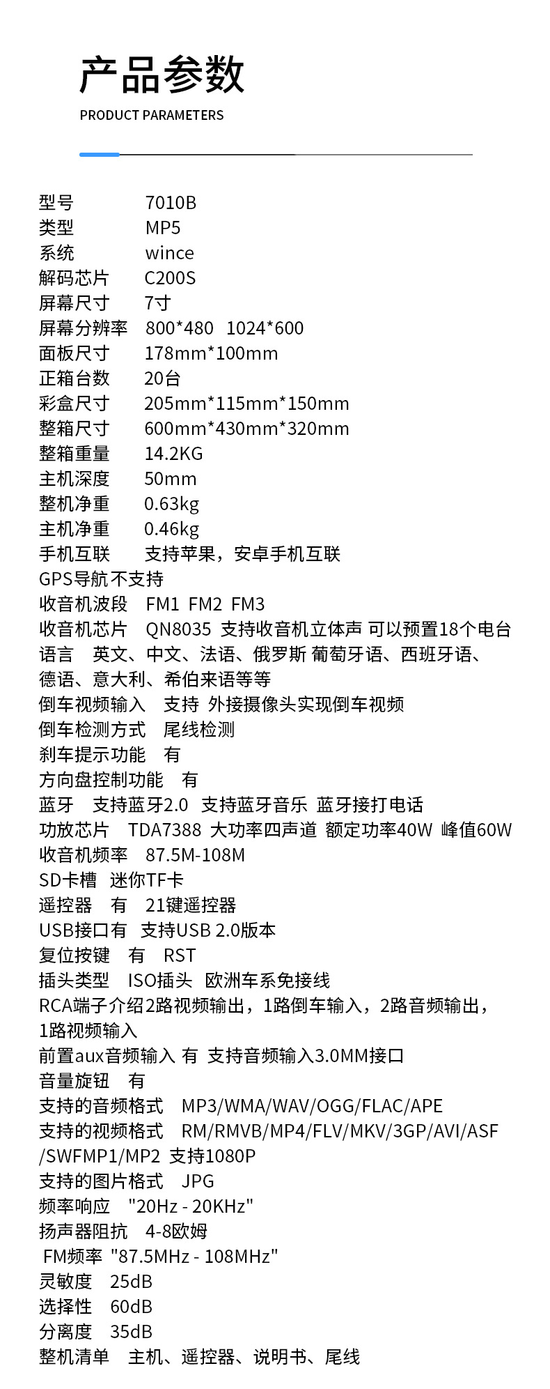 | Спецификация | Разрешение MP5-плеера 800*480, F133/MP5 с Carplay, лимитированная версия с разрешением 1024*600 |