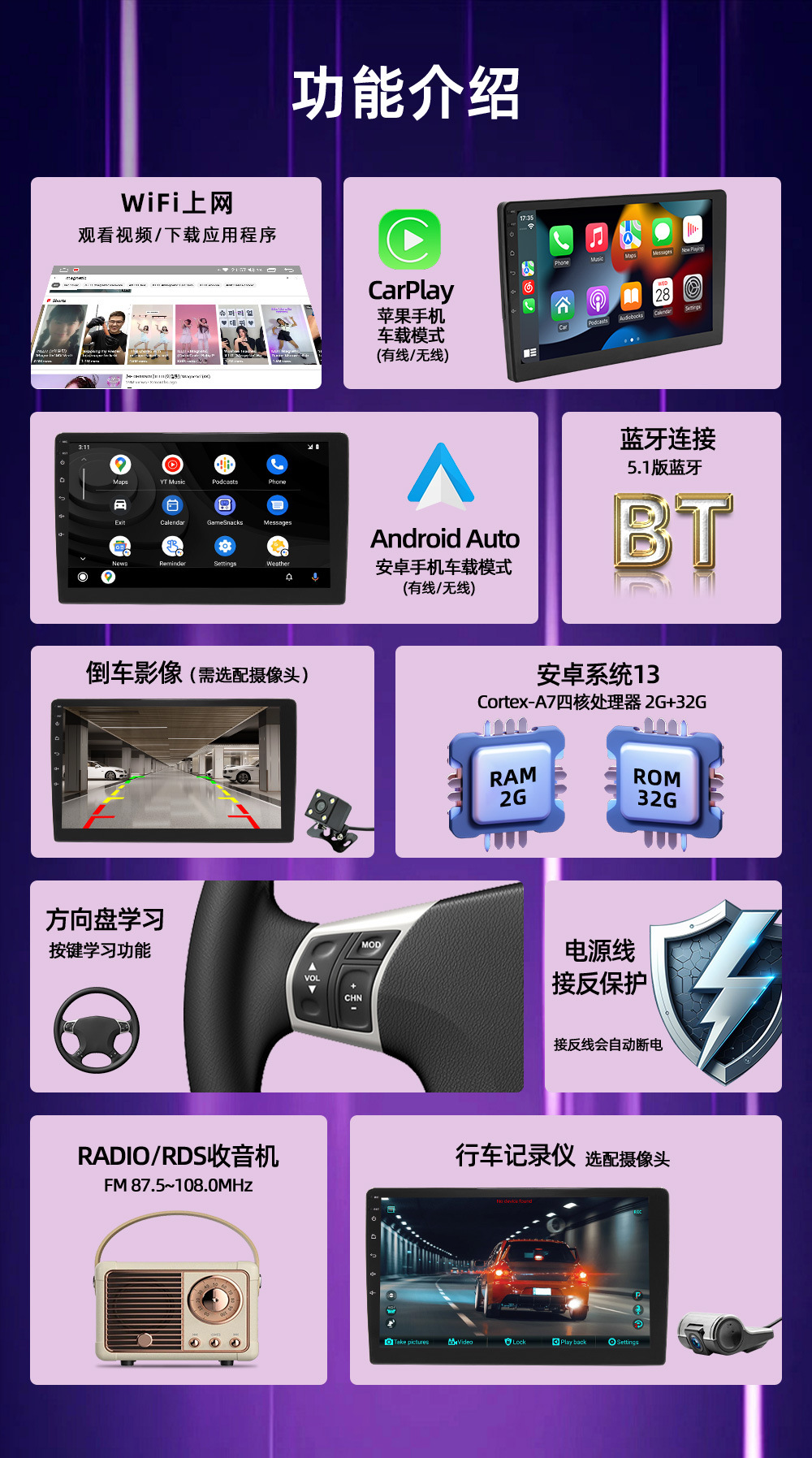 •行车记录仪(摄像头选配),实时路况记录,回放视频清晰让您行车安全有保障